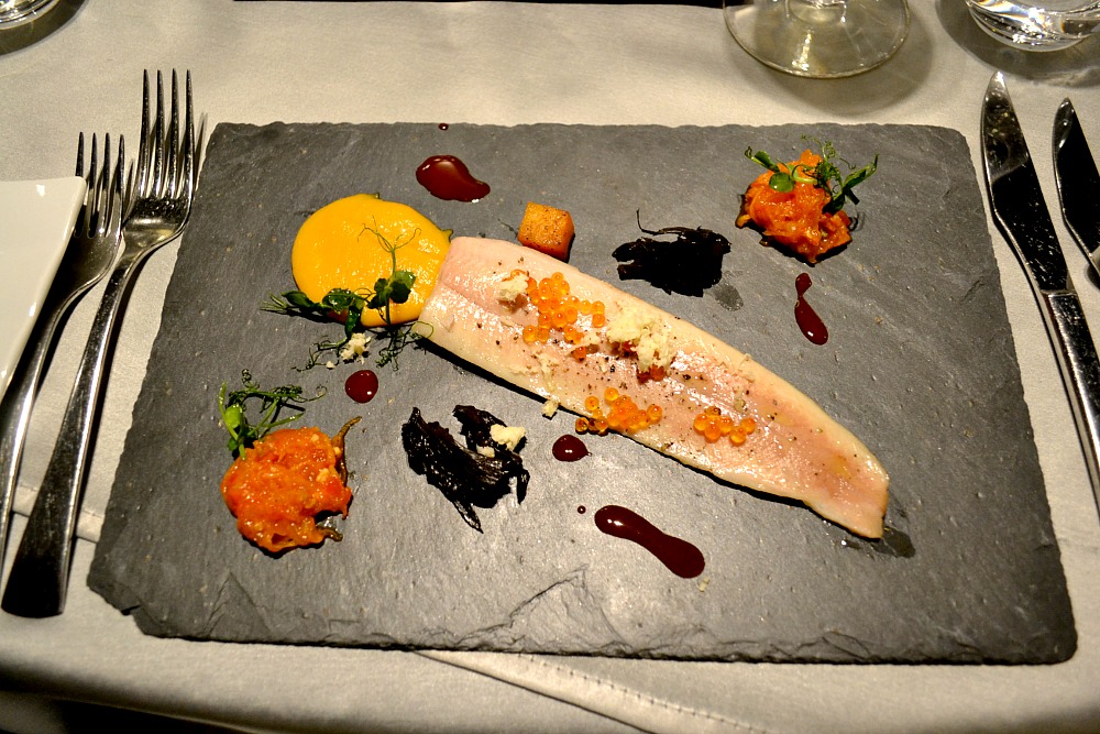 Pstruh „sous-vide“, dýně, stroček. Dýni tu najdete rovnou ve třech podobách – ty dvě hromádky jsou čatní, pak opečená kostička a navrch pyré. Na to, že nejsem dýňový fanda, milé chuťové překvapení. Stročky čerstvé (i když si nedokážu představit realizaci takových dodávek po celý listopad), podušené. Kapiová omáčka. Pstruh se dělal jen pár minut, ponechal si skvělou strukturu, jen ten pstruží kaviár je na rozdíl od jeseteřího poněkud křupavý až nerozkousatelný. Vzhledově se mi tenhle talíř líbil určitě nejvíc a chuťově bezvadně ladil.
