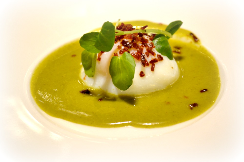 Pošírované farmářské vajíčko, řeřicha, slanina. Taková jarní snídaně. Chod, který bych z podzimního menu klidně vynechala, ale zas jsem ochutnala vajíčko vařené v nízké teplotě – v pošírované podobě má pak zásadně jinou konzistenci – celé je homogenní, rosolovitě třaslavé jako tricepsy mojí babičky při svižném upažení, stejně uvařené na povrchu i v úplném středu, žloutek netekoucí. Vajíčko úplně neosolené, zato dosti slaná řeřichová omáčka plus slanina.