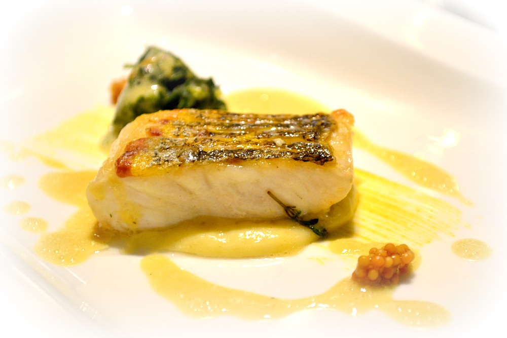 Pečený candát s kapustou, hořčičná pěna, bramborová espuma. Výborná volba. Kuličky jsou z hrubozrnné hořčice, hořčičná pěna sedla k rybě parádně, candát špičkově tepelně zpracovaný – uvnitř šťavnatý, lístkoval, ale kůže opečená, a chválu chci pět hlavně na zpracování kadeřavé kapusty, protože lépe upravenou jsem ji nikde neměla – jemná konzistence, tu a tam jen lehce křupavá, nerozbředlá, dochucená slaninou. Respekt, Stefan.