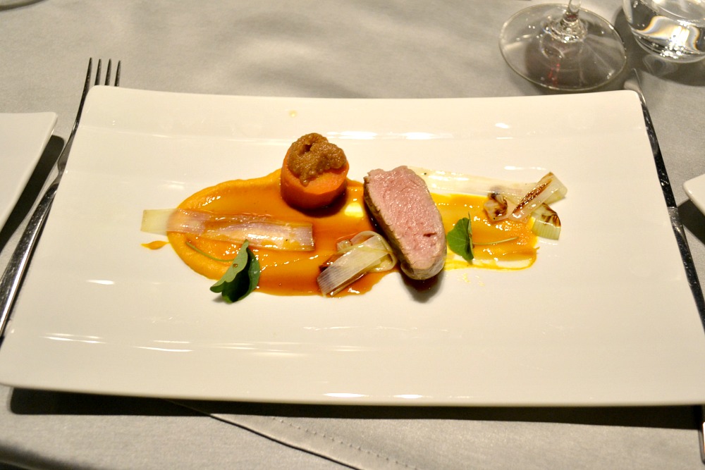 Telecí hřbet „sous-vide“, mrkvové pyré, pórek. Další chod pomalu vařený při nízké teplotě ve vakuu. I telecímu tahle metoda sluší. Vidíte k tomu telecí jus a také mrkvičku vařenou v mrkvové šťávě a navrchu strouhanka zezlátlá na husím sádle. Svěží, ale podzimní. Lehké. Moc dobré.