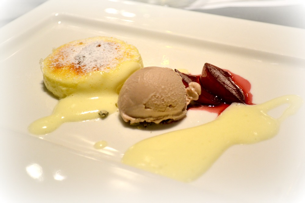 Tvarohové soufflé, švestky, zmrzlina z červeného vína, sabayone. Jsem nedezertová. Nemám ráda sladké. Nemusím ho jíst rok a nepomyslím na to, že by mi něco chybělo. Radši si dám tlačenku s cibulí. Ale tohle soufflé jsem snědla beze zbytku. Právě proto, že se nejedná o nic moc sladkého. A bublinky, ty já ráda, takže sabayone ze základu žloutky/šampaňské potvrdil, že jsem udělala dobře, že jsem do tohohle chodu ještě šla.