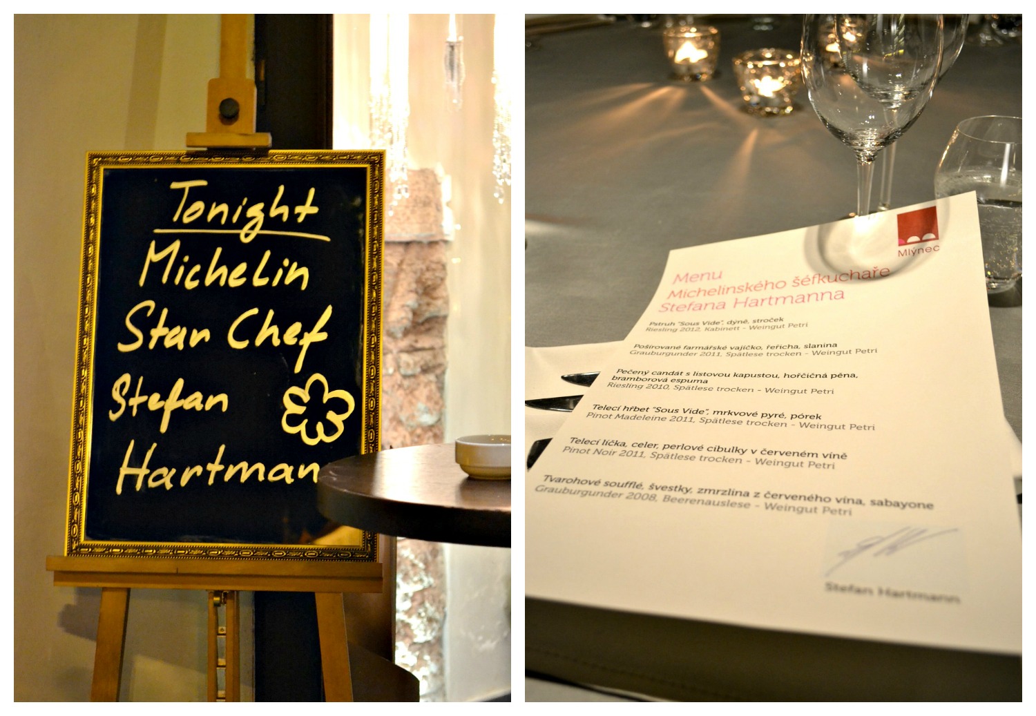 Pojďme si toho dočasného šéfa mlýnecké kuchyně trochu představit. Jmenuje se Stefan Hartmann, vede malou restauraci HARTMANNs v Berlíně. Je otevřená od roku 2007, vejde se tam maximálně 45 hostů, momentálně vlastní jednu michelinskou hvězdu, otevřeno mají pouze od úterý do soboty a vždy jen večer, pořádá tu i kurzy vaření. Aktuálně nabízí v degustačním menu např. konfitovaného humra s dýní, v mléce pošírovanou rybu sv. Petra, jehněčí hřbet a jazyk s artyčoky nebo dušené jehněčí ramínko – toho jsem se dovtípila z anglické verze jídelního lístku na jejich webu – tedy alespoň doufám, že tomu tak je. Jehněčí je tam totiž za lampu – Saddle od lamp a Braised shoulder of lamp :-D Asi by měli využívat lepšího překladače. Se stane, no… I těm nejlepčím :) Vcelku to chodí tak, že se jezdí vedení se šéfkuchařem restaurace, tady Mlýnce, inspirovat do Evropy. Říkejme sondovat. Výsledkem sondáže je pak moment, kdy si někde opravdu pochutnají, pokecají se šéfkuchařem, zjistí, jestli by si nechtěl udělat vejlet… nabídnou za to mně skrytou částku a on řekne: Ok, tak já přijedu na tři dny (31. 10.–2. 11. 2013), budu u vás vařit to, co chci, sestavím meníčko, naučím to vašeho šéfkuchaře a jeho družinu. Odjede a restaurace bude ještě nějakou dobu (celý listopad) tohle degumenu nabízet – ale vařené už klasickým místním osazenstvem.