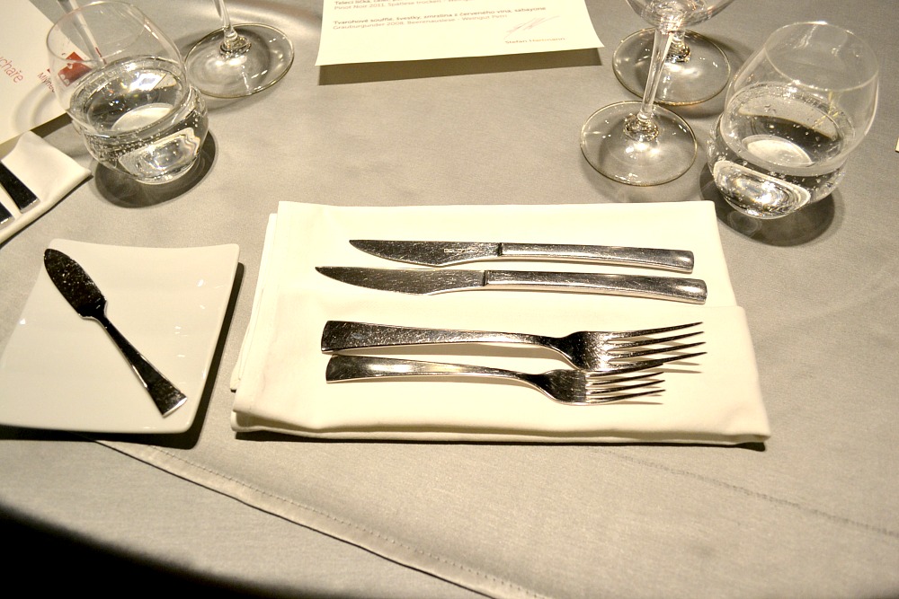 Když jsem usedla ke stolu, měla jsem před sebou tenhle pohled, tak, jak to vidíte na fotce výš. Říkám si: „To je ale zvláštně prostřeno. To si to mám teda sama všechno rozeskládat?“ Moc se mi to nezdálo. Nicméně realita se mi nezdála víc. Přiskočila ke mně obsluha a vidličku po vidličce, nůž po noži mi začala přeskládávat příbory do obvyklé polohy, stačila jsem během toho prozkoumat kvalitu textilie na číšníkově rukávu a přemýšlet, jestli se mi do ní bude dobře smrkat, jak mi tak míjela nos o prsa čínské gymnastky. Uznávám, nos nemám nejmenší, ale stejně. A jako tečku rozložil můj ubrousek, jako když chcete povlíknout postel, jedním mrskem a oběma rukama mi ho umístil na stehna. Mám ráda, když můžu ve vší hostovské naivitě nechat sama sebe utopicky snít, že bílá rukavička na číšníkově ruce ladně kladla každý kus z mého příboru na své místo a ve chvíli, kdy usednu, budu mít právo první noci. Že můj otisk prstu bude prvním a jediným, určí, komu tyhle vidličky a nože dnes večer patří. Hříšný tanec jste viděli všichni, takže mi budete rozumět: tohle je MŮJ taneční prostor! U dokládání inventáře to chápu, i když tam by se mi ta rukavička taky líbila víc, ale takové přemisťování tolika věcí hned na začátek mi připomnělo překladiště přístavu v Rotterdamu.