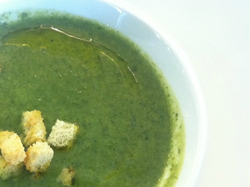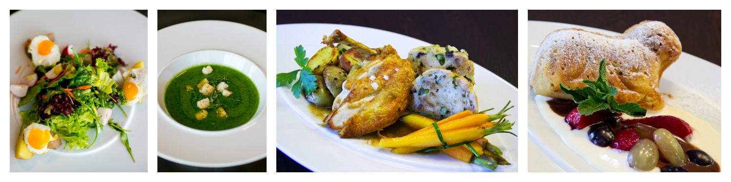 Dále, už oficiálně, tu máme Krém z čerstvého špenátu a mladých kopřiv s parmazánovými krutony. České kopřivy jsou bohužel vzhledem k extrémně vleklé zimě absolutní utopií, takže jsou nahrazeny italskou produkcí perily, to se nedá svítit. Chuť svěží, vyvážená, krásně zelená = nepřesmetanovatělá. Kdyby tam plavaly tři sedmikrásky, hned by to jaro vonělo ještě desetkrát víc, ale i ty se teprve klubou.