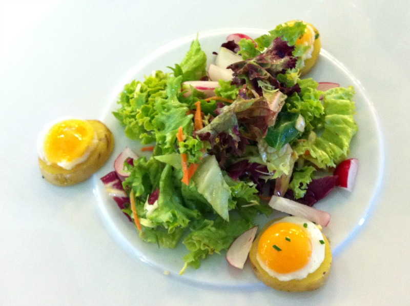 Vrátím se krátce na první ochutnávku, na Green Yacht. Děje se tu takový malý švind ve prospěch návštěvníka, který nedostane 3 chody, ale vlastně 4. Na začátek, nečekán, nezván, ale vítán, přichází salát s jarní zálivkou, křepelčími vajíčky a plátky brambor. Doslova s otevřenou náručí bych ho vítala ještě v případě, že by vajíčka a brambory byly osolené a opepřené a kdyby v jarním salátku bylo přítomno víc jarně vyhlížejících malých lístečků – tedy hlavně rukola, polníček a další na trhu dnes dostupné, frajeřinkou by byly čerstvé ředkvičkové listy.
