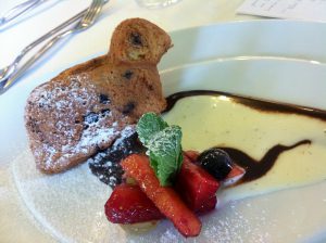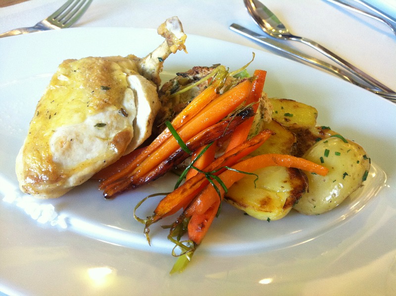 Následně dorazila Čtvrtka kukuřičného kuřátka pečená s jarní nádivkou, čerstvými bylinkami, glazovanou karotkou a brambory Grenaille. Čtvrtkou je myšleno supreme z kukuřičného kuřátka – prsíčko s kůží a prvním článkem křidélka (v tomto případě jen kůstkou). Maso bylo opravdu úžasně měkké a šťavnaté, naprosto paráda, oželela jsem i to, že se tak stalo na úkor upečené křupavé kůžičky, leč s ní by bylo lépe. Byly toho porce pro 2-3 Koko. Stále nepřicházím na chuť způsobu úpravy Grenaille do stavu, kdy se o nich už jednu vteřinu nedá říct, že by byly nedovařené, ale to je čistě můj problém. Beztak mi ke kuřeti stačila jako příloha nádivka (schovaná za mrkvičkami). Ta by ode mě dostala 6/10 bodů, pro absenci výraznějších chutí.