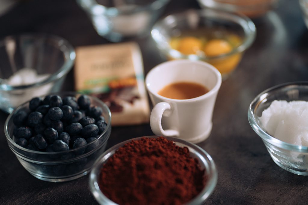 Do další misky přijde to připravené kakao a zalít horkou kávou. Promíchat. Ten přídavek kávy nám tam zvýrazní ty kakao čokoládové chutě, to, co chceme v tom výsledném dezertu. Chceme tedy homogenní hmotu, co nejvíc hladkou. Do toho vajíčka. Přidáme třtinový cukr a vanilkový cukr a zamícháme. No a zbývá nám sypká směs – úplně jednoduše nasypat k tomu, co už máme připravené.