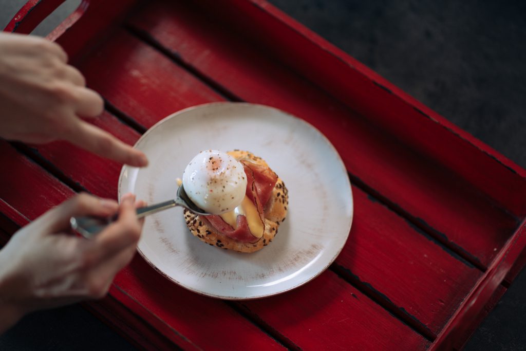 Na nahřátou housku se šunkou dejte lžíci omáčky, na to osolené a opepřené horké vajíčko a navrch pořádná porce další bleskové holandské omáčky. A posekaná pažitka. A samozřejmě, musíme rovnou zkontrolovat, co se skrývá uvnitř!