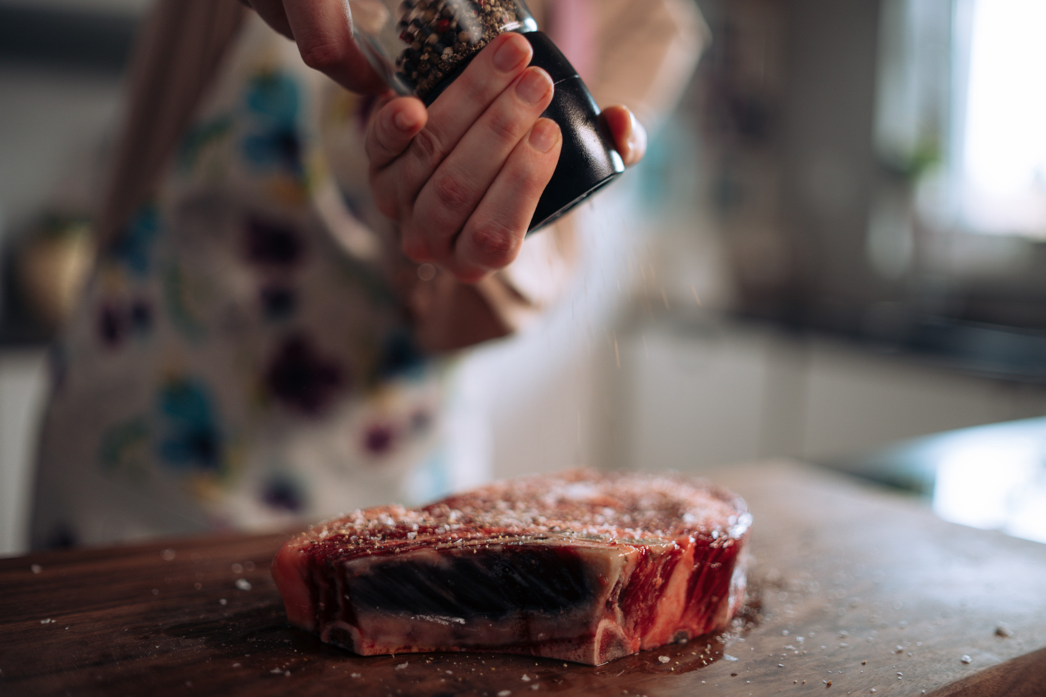 - Teď sůl. Když si budete myslet, že jste ten steak přesolili, tak jste ho osolili naprosto správně. A pepř. Čerstvě mletý, samozřejmě. A to samé z druhý strany.