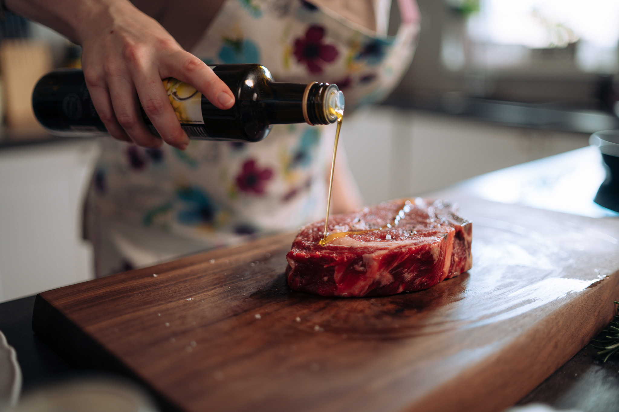 - Budeme používat olej, ale ne na pánev, ale na steak. Ukápneme, pohladíme.