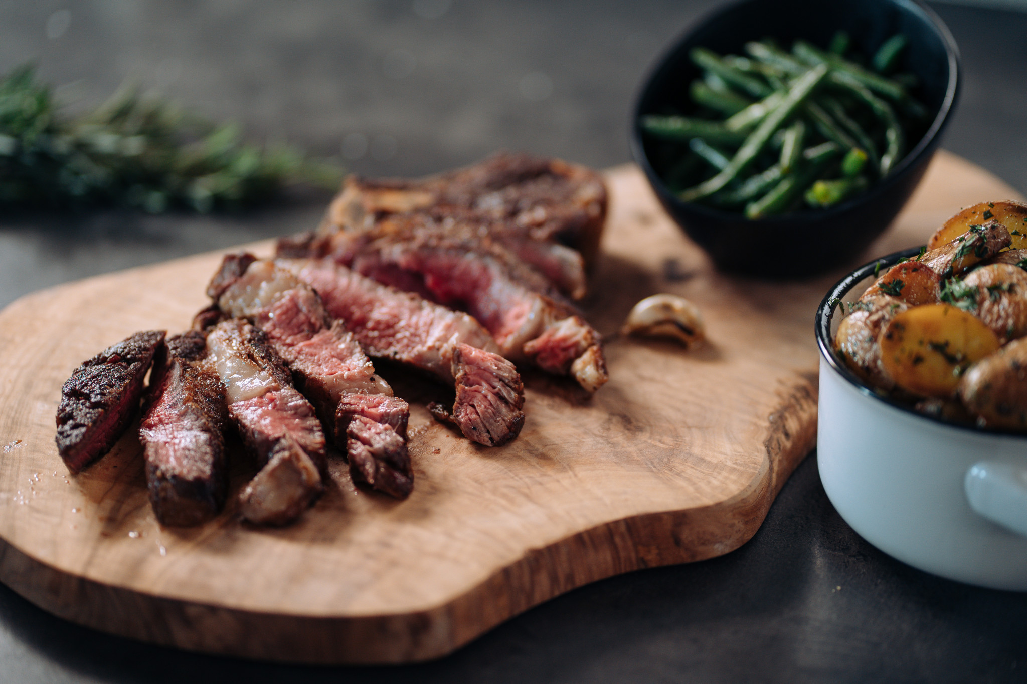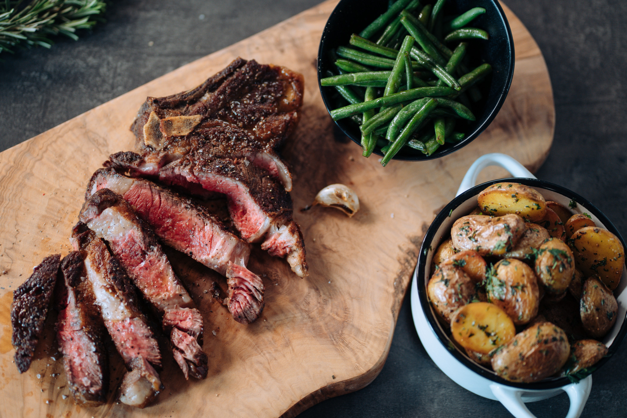 minimálně lžíci. Hned jak se rozpustí, nakloňte pánev a přelívejte maso ovoněným máslem. - Velký kus bude potřeba nechat dojet ještě v troubě. Použijte pekáč, na který položíte osmahnutou bylinku a česnek, vytvoří voňavou podestýlku pro pana steaka, a využijte i veškerý