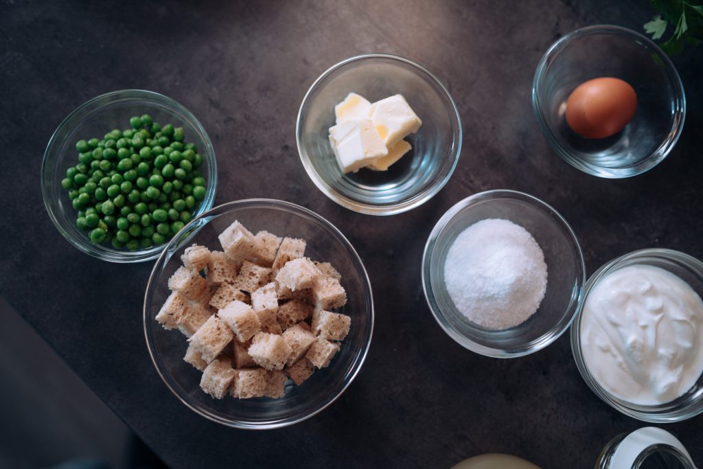 Do nádoby mixéru vložte spoustu petrželky, střídku včerejšího chleba tedy bez kůrky a projedeme to, aby vznikla taková voňavá bylinková strouhanka. Následuje připravené zbylé maso z prsíčka, to nezapomeňte osolit, teď je nejlepší čas – stačí lžička, a ještě vajíčko plus pro zvláčnění zakysanou smetanu s 12% tuku. Promixujeme. A až teď ještě přisypeme hrášek. Tři čtyři lžíce. Dál už nemixovat, ten tam má zůstat v celku! jen ho do fáše jemně vmícháme.