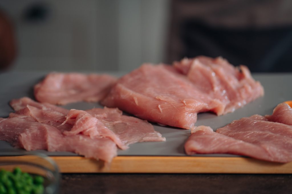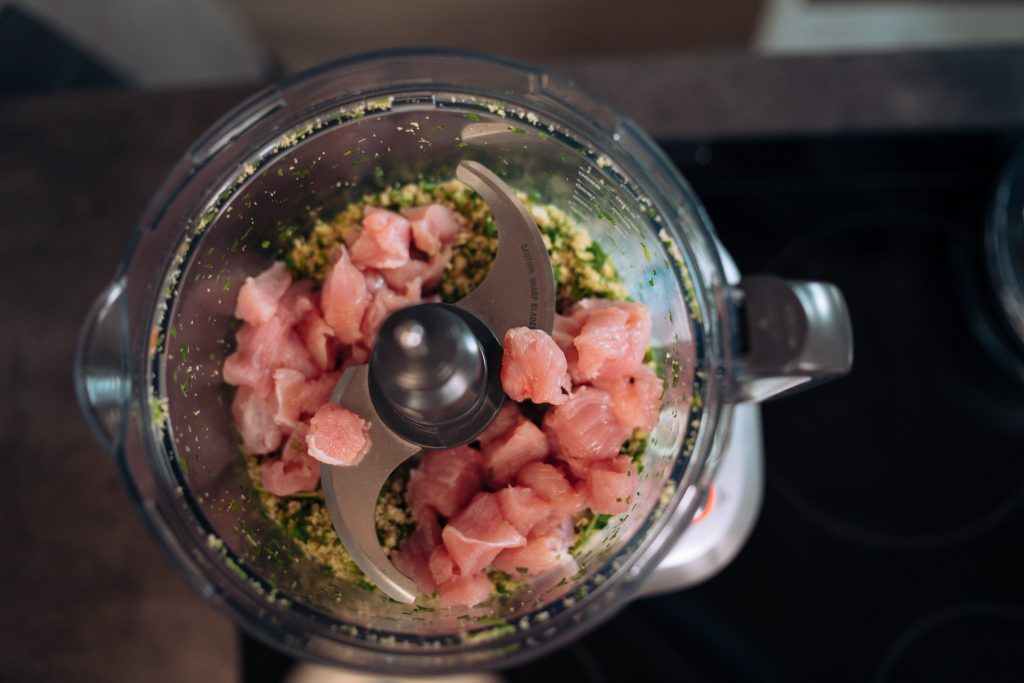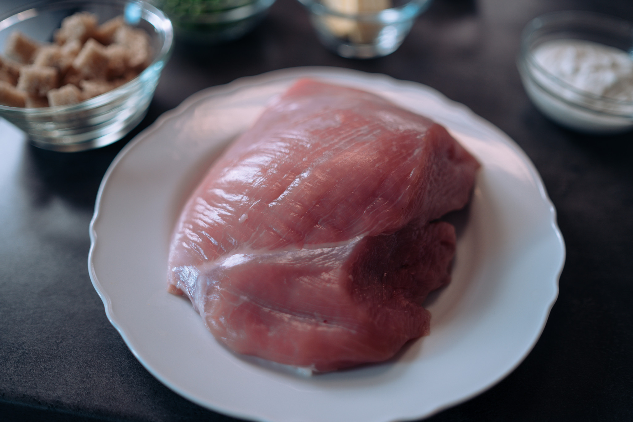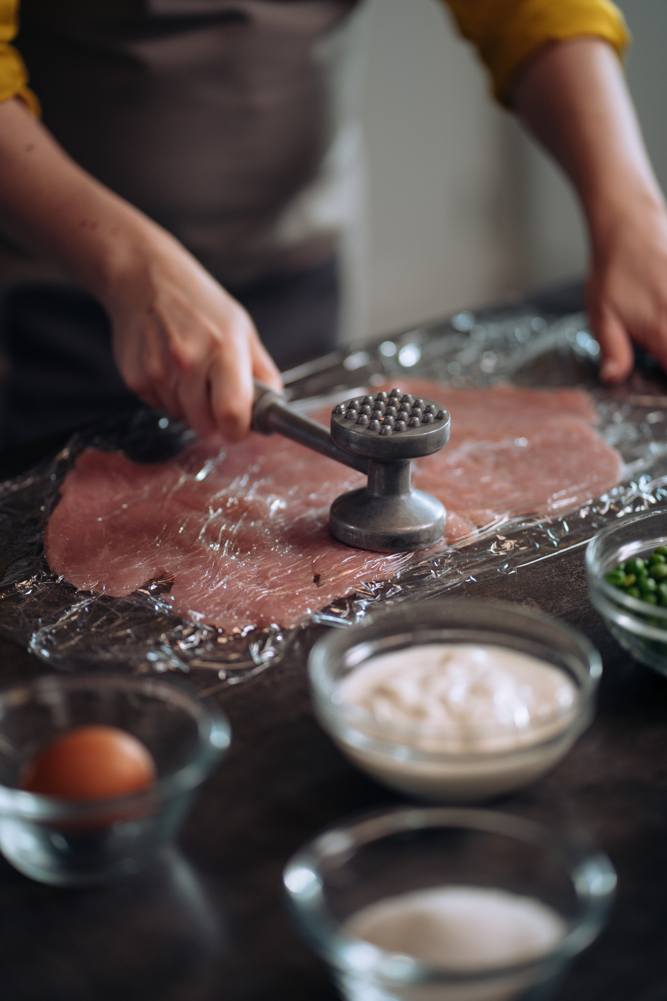Necháme našeho chlapa, aby si zahrál na řezníka a naplátkoval prso na co největší půlcentimetrové pláty – stačí takhle připravit něco přes polovinu váhy. Ze zbytku masa si v mixéru připravíme fáš spolu s chlebem, bylinkami, vejcem, olejem, solí, pepřem a zakysanou smetanou. Když směs umixujeme, ještě přidáme rozmražený hrášek.