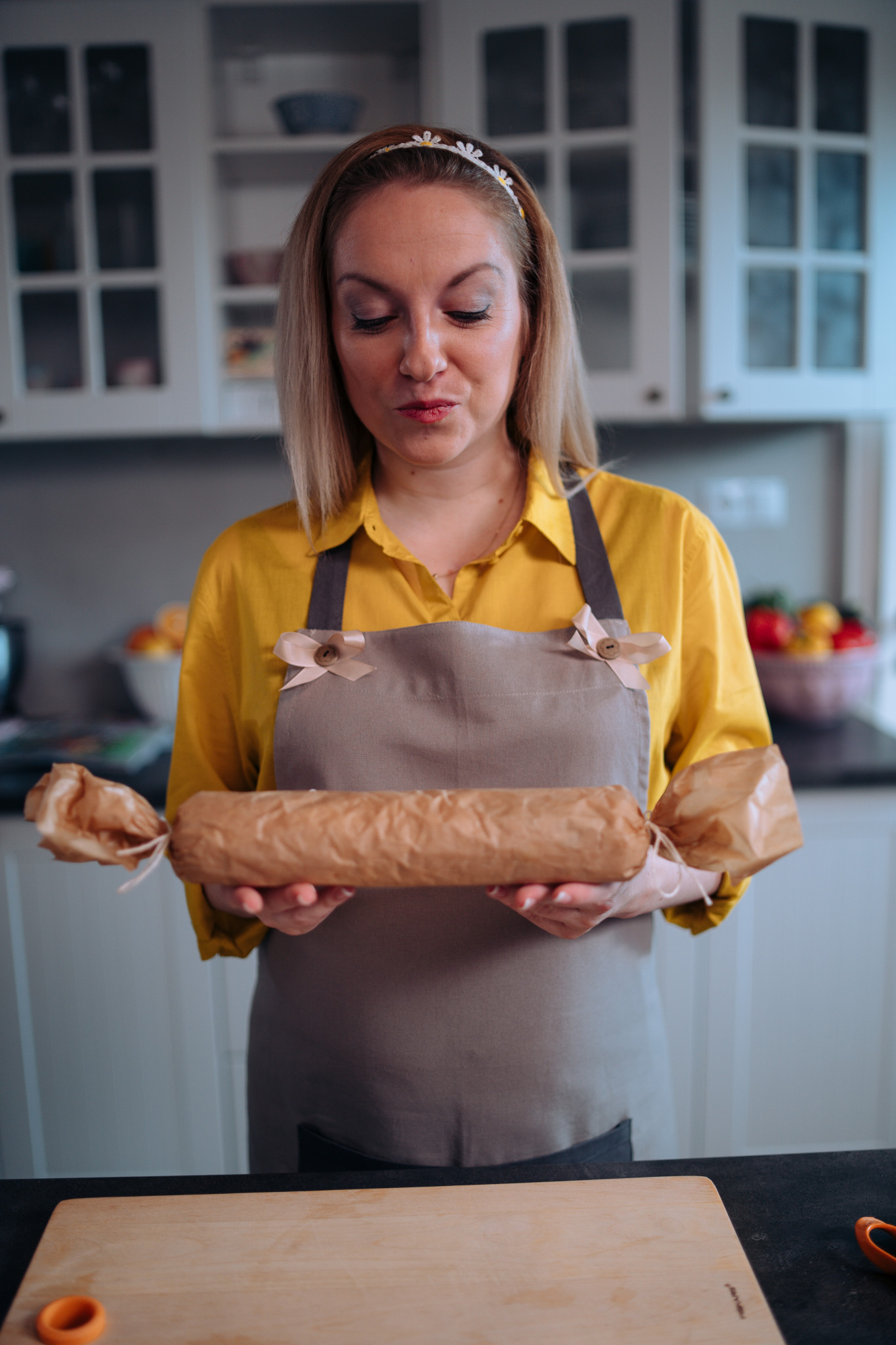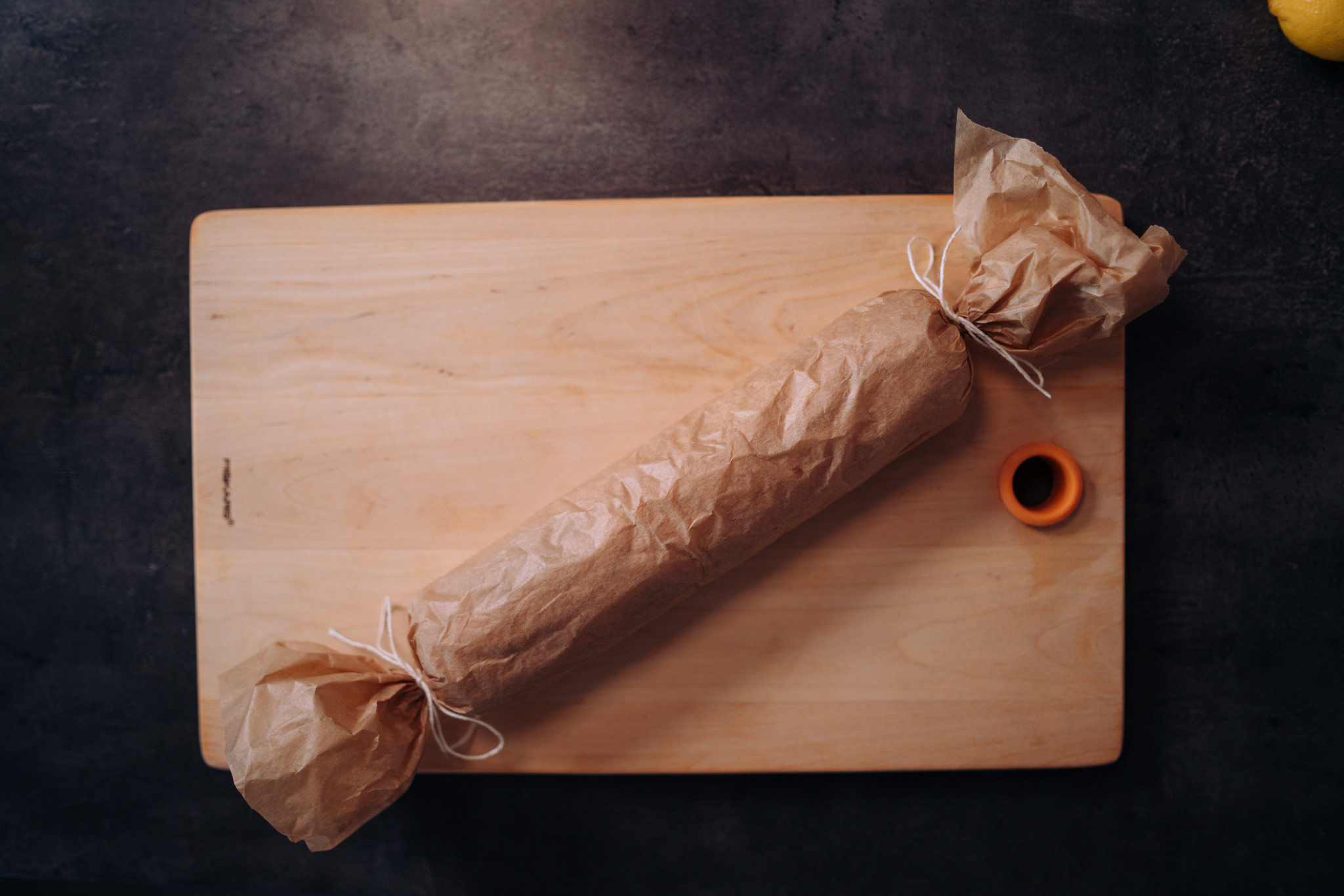 Teď je načase se vrátit k tomu plátu masa, který máme připravený, protože ho musíme dostat z té fólie do pečícího papíru. Chmat nechám na vás, ale ve videu předvádím ten svůj :) … Upravte maso do tvaru obdélníku, plát lehce osolte, taky opepřete, a začněte rovnoměrně roztírat fáš v asi centimetrové vrstvě. Zbývá už jenom zarolovat. Nebojte se toho. A ještě zpečetit kuchyňským provázkem po obou stranách.