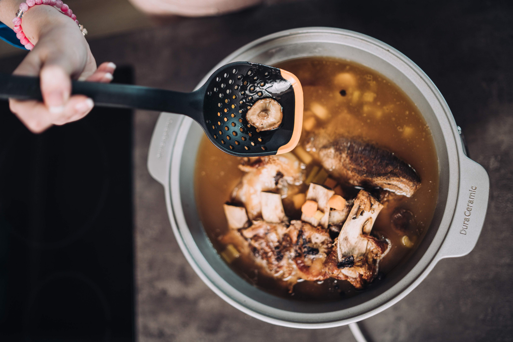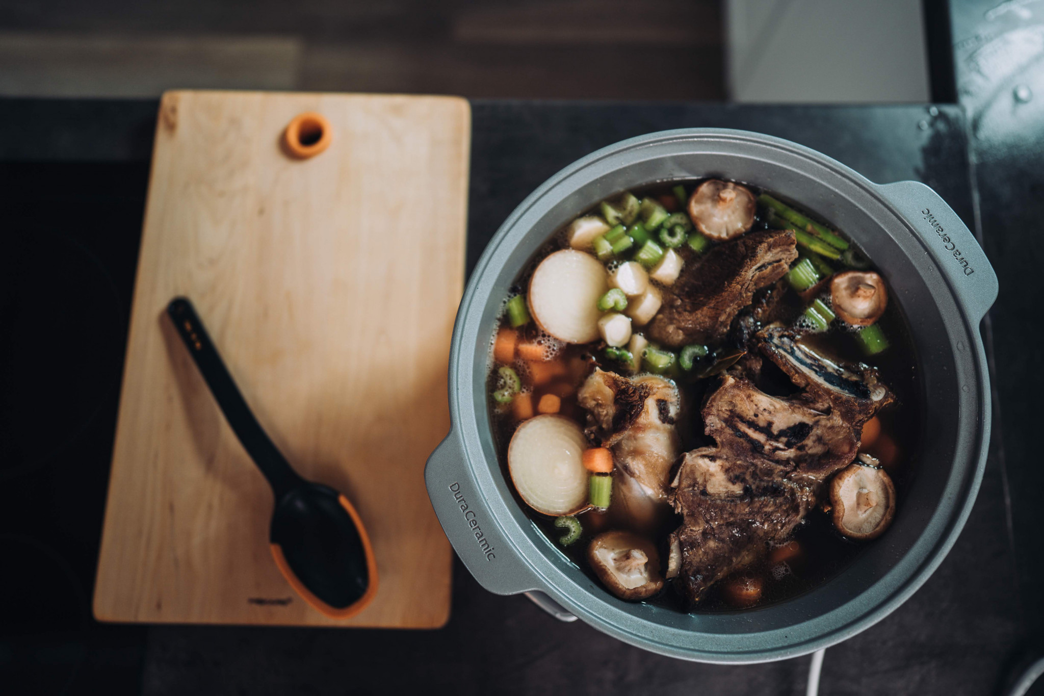 Pořiďte kosti, ožez a taky kousek masa, ať máme ve finále i reálné železo do polévky. Nejlepším pomocníkem je pomalý hrnec – elektrická záležitost, která si sama kontroluje teplotu tak, abyste vývar táhli a ne vařili, abyste během vaření mohli spát, kojit, utěšovat, chodit na procházky a všechno to ostatní. Prostě hlídali dítě a ne vývar. Ve vnitřní nádobě nejdřív omyté kosti zapečeme v troubě. Díky tomu se vývar nezakalí a bude mít lepší chuť i barvu. Zapékáme na 220°C minimálně 20 minut. Vyjmeme z trouby, slijeme případný vypečený tuk, přidáme pyramidku s kořením, špetku soli, zalijeme studenou vodou a nastavíme hrnec na vaření těsně pod bodem varu na minimálně 8 hodin. Přiklopíme a ničeho si nevšímáme, dokud se neblížíme ke konci.