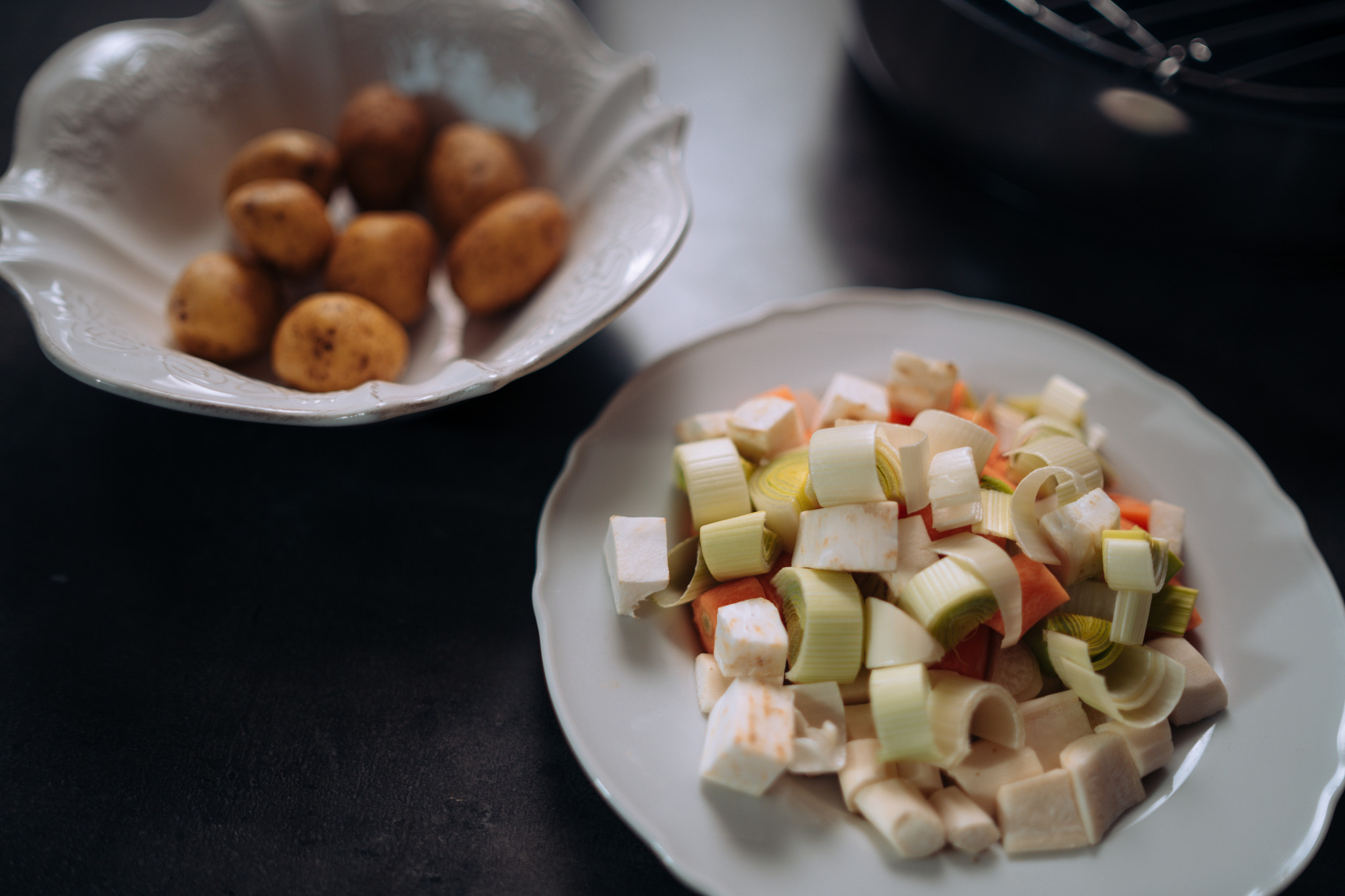 Provozní proto, že jde o základní recept jak na klasický nedělní oběd (tedy pečené kuře se šťávou a s bramborem) tak hlavně o přípravu suroviny k dalšímu vaření – tedy pečené kuřecí maso, které se pak dá využít postupně do sandwichů, salátů, do polévek. Je to surovina, kterou jsem doma v lednici měla během kojení radši než kopu uzenin a používala maso i k snídani místo salámu atd. To „příslušenství“ znamená, že z jednoho celého kuřete, jednoho balení zeleniny na polévku a jednoho balení přikoupených kuřecích krků navíc může vzniknout spousta masa k dalšímu použití, základ na luxusní omáčku nebo sos, druhotný vývar z obraného pečeného skeletu a kostí a zbytku ze základu omáčky. A když přidáme malé jarní brambůrky, máme to i s luxusní přílohou. Ve šťávě pečené brambory jsou úžasné samy o sobě, ale když se pak navíc ještě opečou, už je nebudete nikdy chtít vařit jen ve vodě.