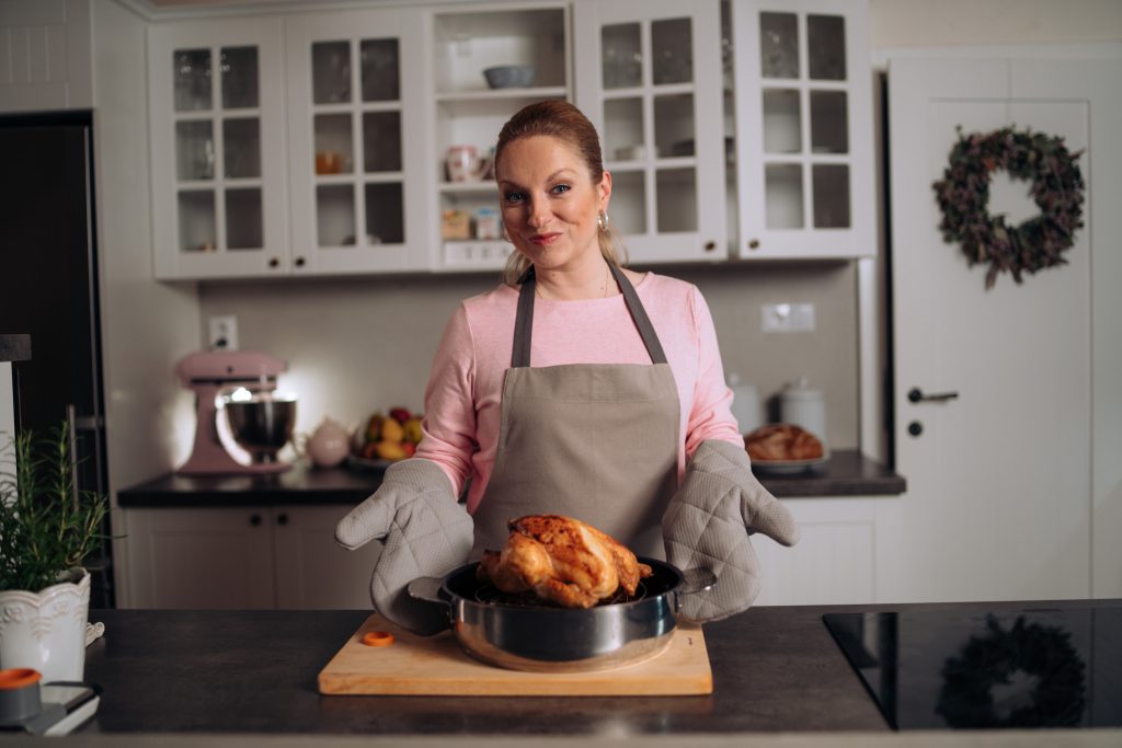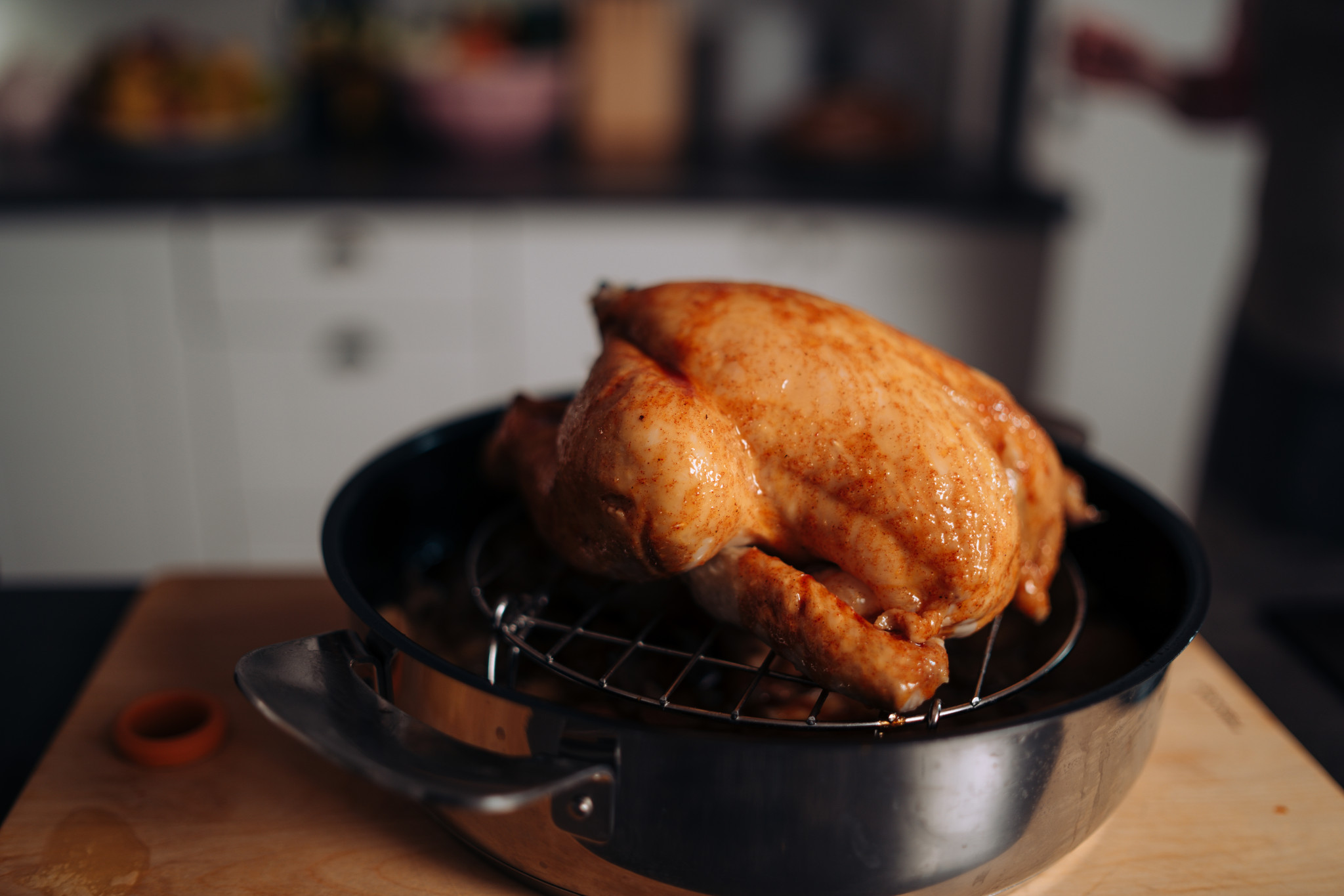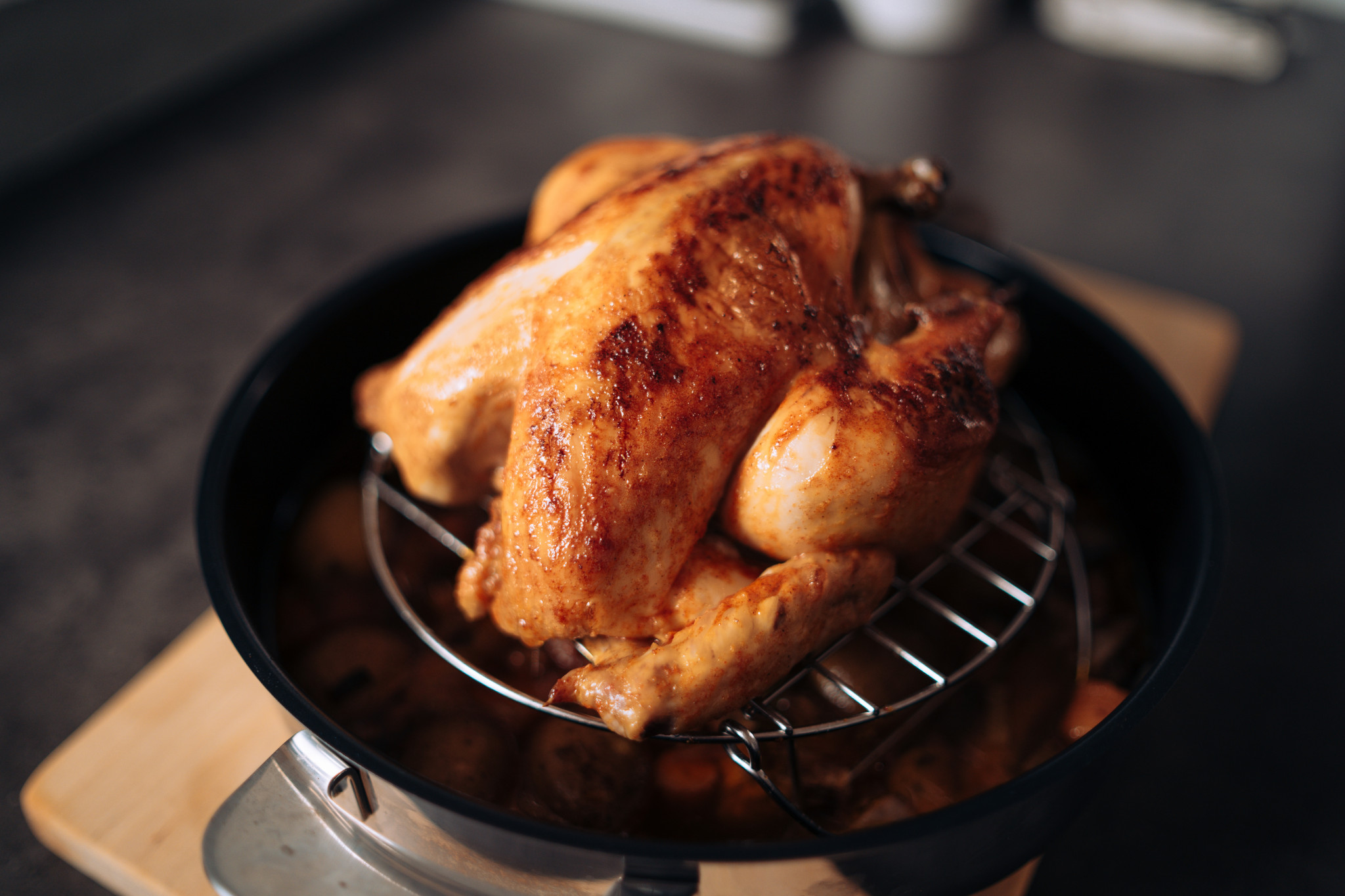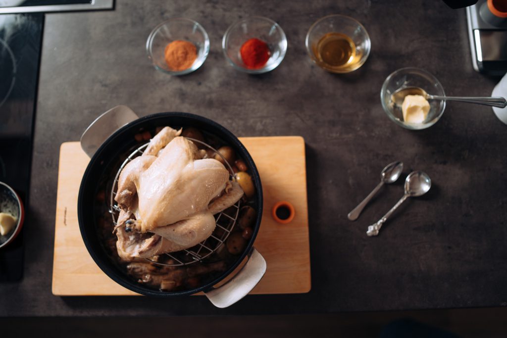 Množství aktivní práce je přitom minimální. Potřebujeme velký hrnec, který můžeme i s poklicí dát do trouby. Ideálně těžký s nepřilnavým povrchem. Musí se sem vejít vrstva surovin na sos, mřížka a pak ještě celé kuře tak, aby se vše dalo pohodlně přiklopit poklicí a ta se nelepila kuřeti na kůži.