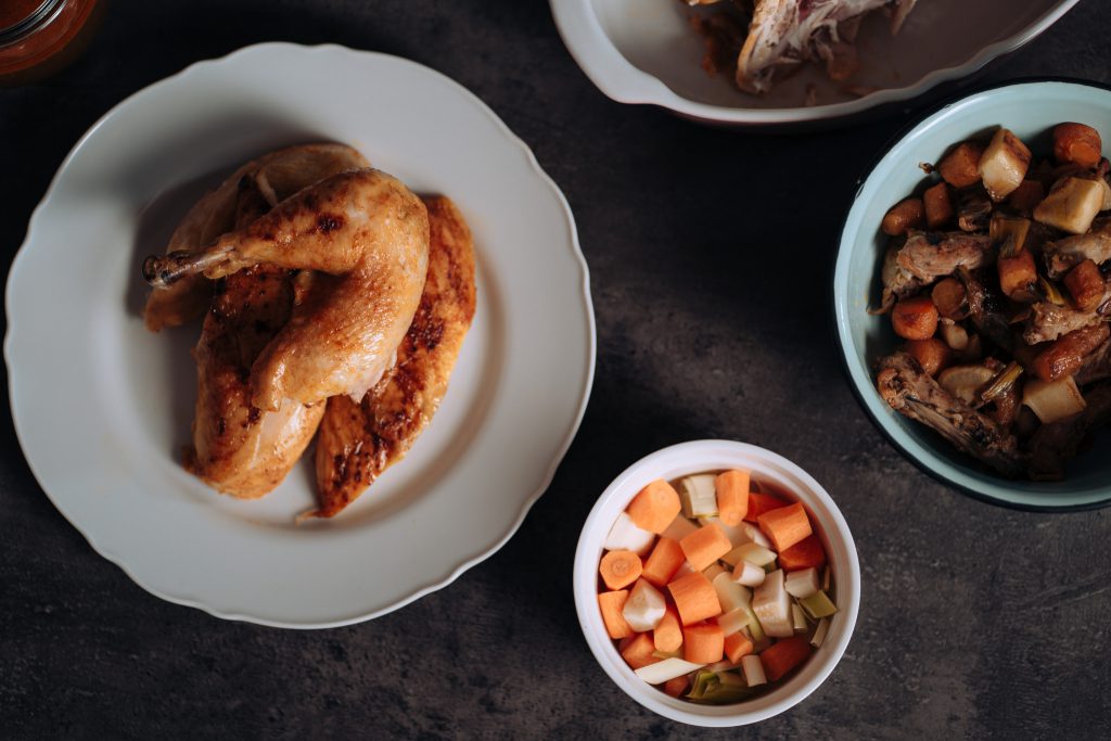 Vyskládáme si tedy vše, co nám tu vzniklo: do krabičky krásné zlatavé šťavnaté kuřecí maso, do sklenice hutný sos a pak do petky od kojenecké vody ještě navrch vývar na parádní polévku nebo risotto. Takhle jsme z počátečních pár surovin vytěžili absolutní maximum.