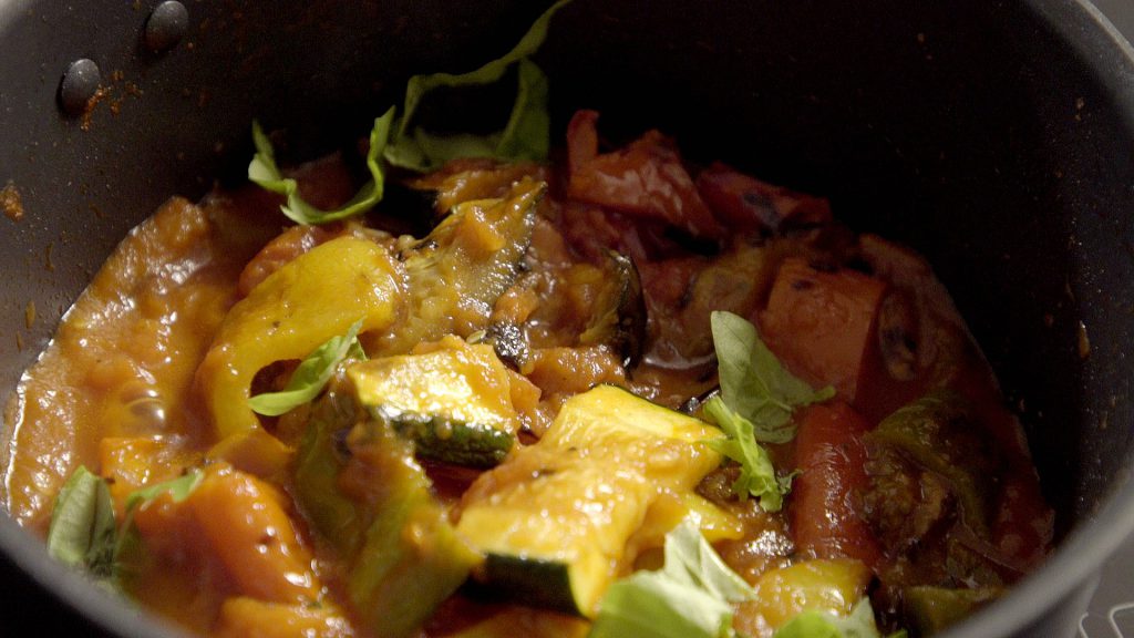Je čas si nachystat i rychlé ratatouille z grilu. Použijte ogrilované a klidně už dávno vychladlé cukety, papriky, lilek, zástupce rajčat tady máme ve formě plechovky, tedy rajčat drcených. Pokud nekojíte, můžete přihodit i grilovanou cibuli a česnek. Pokrájenou zeleninu s rajčaty přiveďte v rendlíku k mírnému varu. Samozřejmě dochutíme: sůl, pepř, a je-li potřeba, tak taky cukr, ta rajčata bývají někdy kyselejší. No a v totálním finiši taky čerstvou bazalku.