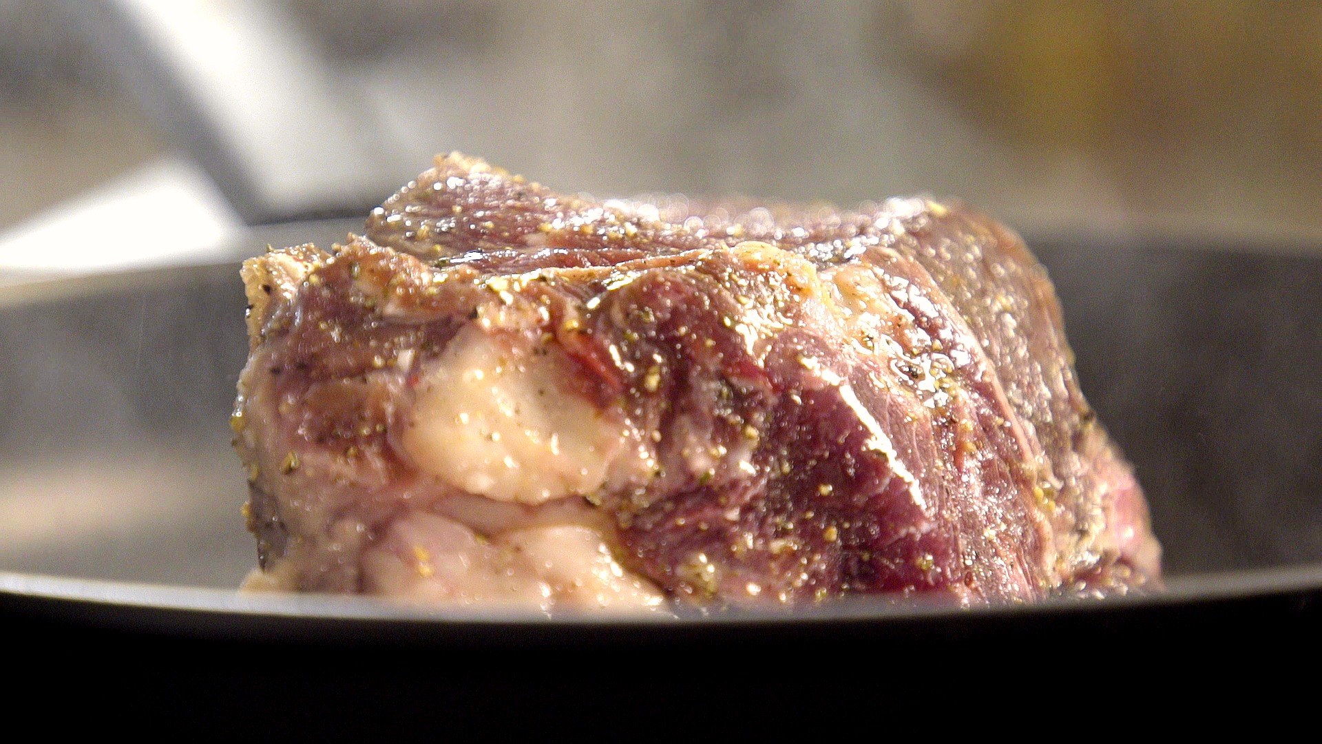 Nejdřív si nasolíme maso ze všech stran. A k tomu další ochucení, které nemůže chybět, a to je čerstvě mletý pepř. Na roastbeef je ideální nízký roštěnec a pěkně odpočatý venku, alespoň půl hodinky, klidně hodinku, aby nedostal pak teplotní šok na pánvi. Teď maso musíme naolejovat. Ze všech stran si takhle pomůžeme a díky tomu nebude už žádný další olej potřeba dávat na pánev a nebude nám to prskat. Když se nám z pánve totálně čoudí, vydáme se maso zatáhnout. Z každé strany, ne dozlatova, ale prakticky úplně dohněda.