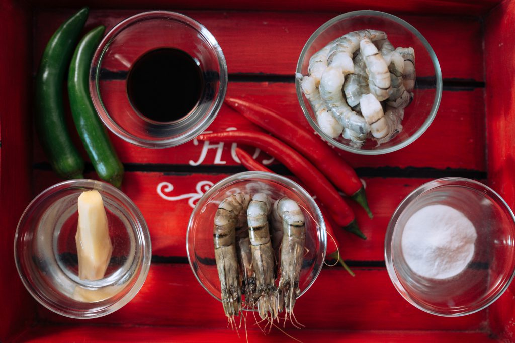 - 8 – 10 ks čerstvých (šedých) oloupaných krevet