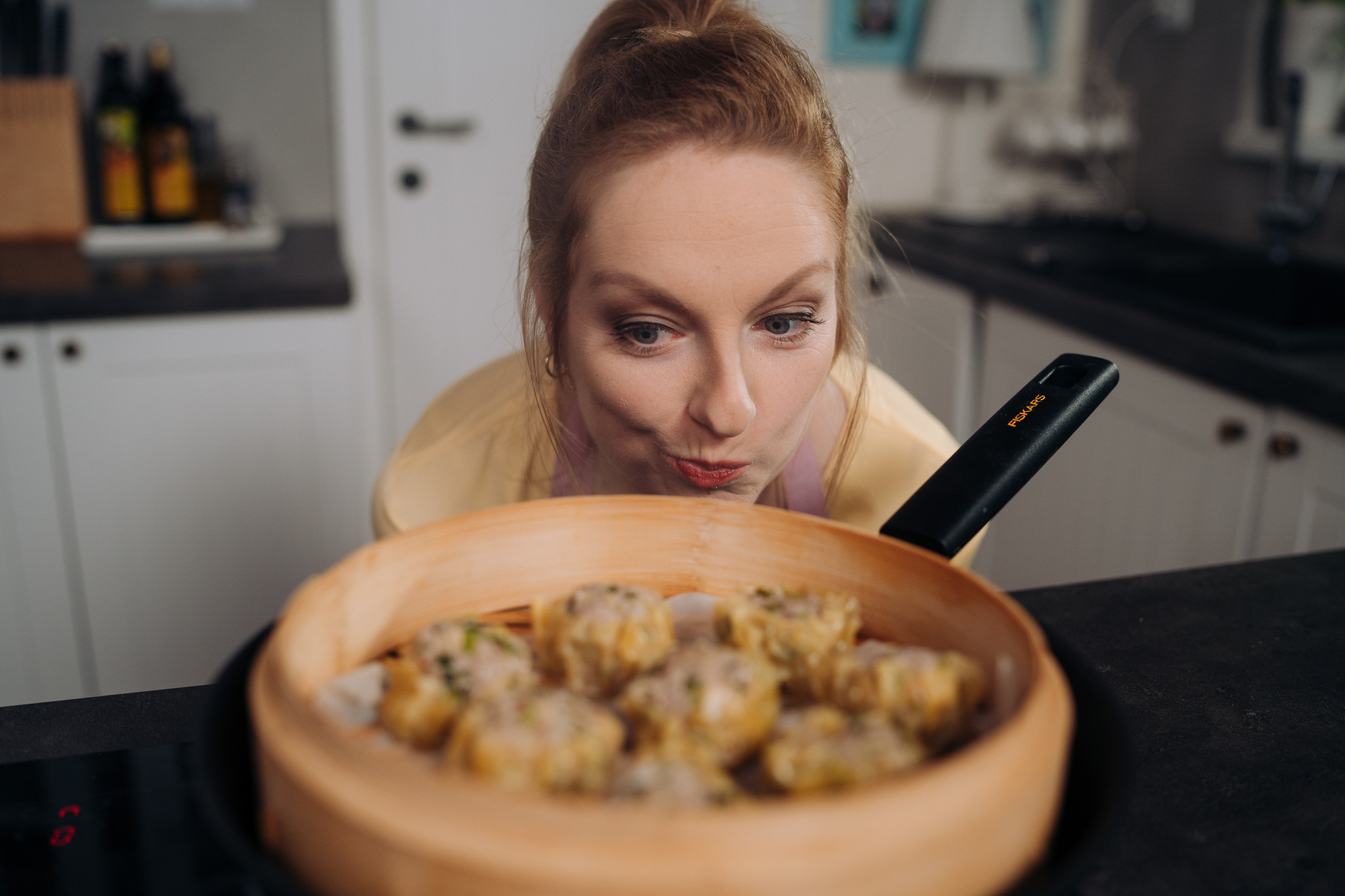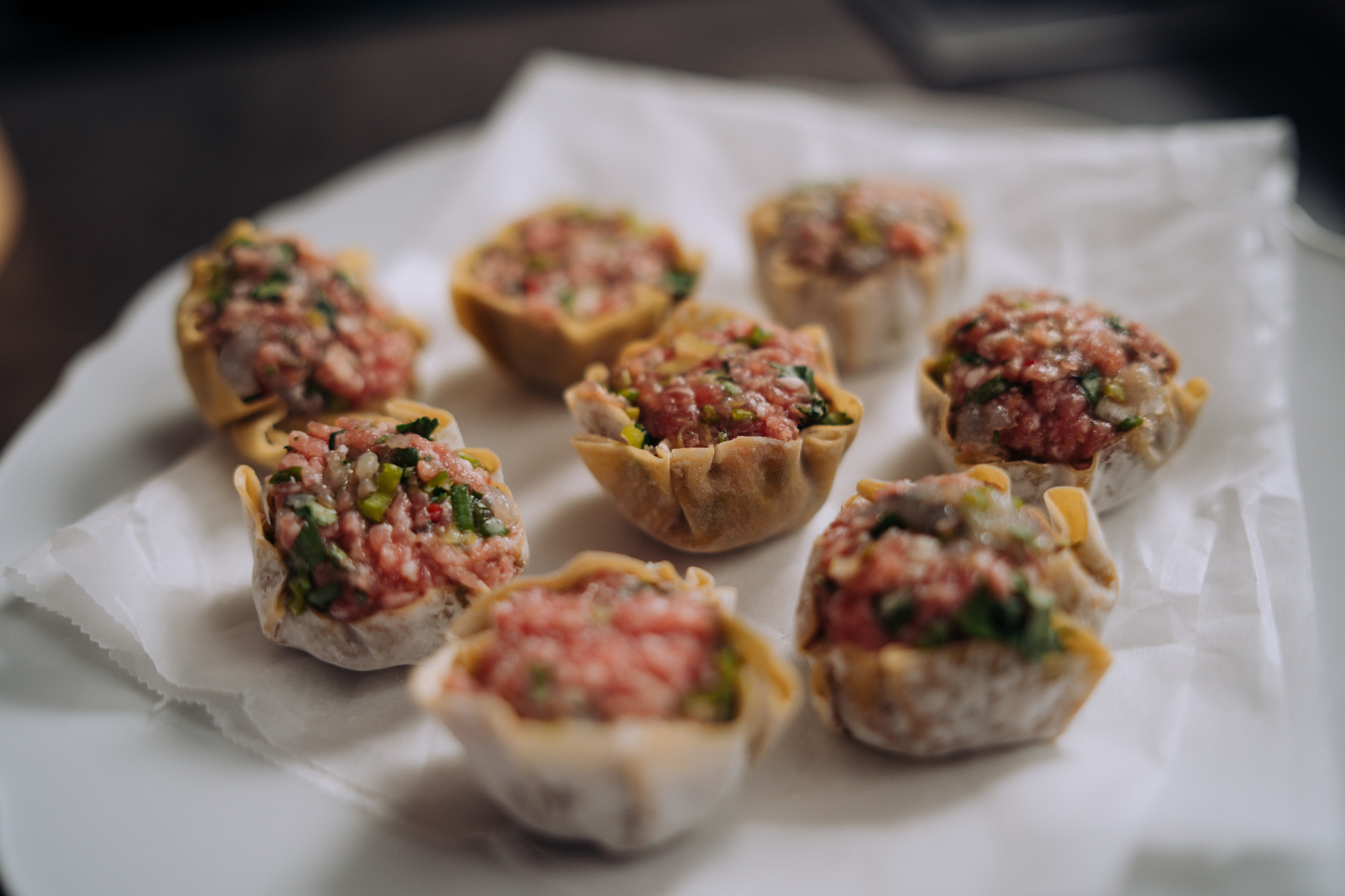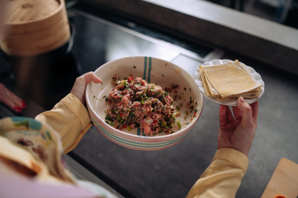 Všechny suroviny je potřeba nakrájet velmi nadrobno, aby se dobře smísily dohromady s mletým masem. Tedy jak chilli, jarní cibulky, krevety i koriandr. Co se zázvoru týče, nejradši ho strouhám na sýrovém struhadle (to velmi jemné na parmazán). Zbavíte se tak vlásků a zázvor je pak tak na jemno, že si do něj nikdy přímo nekousnete, ale jeho přítomnost jasně cítíte, což je určitě dobře. Když dělám knedlíčků víc, všechny ingredience mělním v robotu – nejdříve česnek s jarní cibulkou (vždy stačí jen pár pulzů), pak přidám chilli a koriandr – potom krevety a na poslední chviličku i nastrouhaný zázvor a mleté maso, které se tak s ingrediencemi parádně promísí. Celá směs začne vždycky hned úžasně vonět.