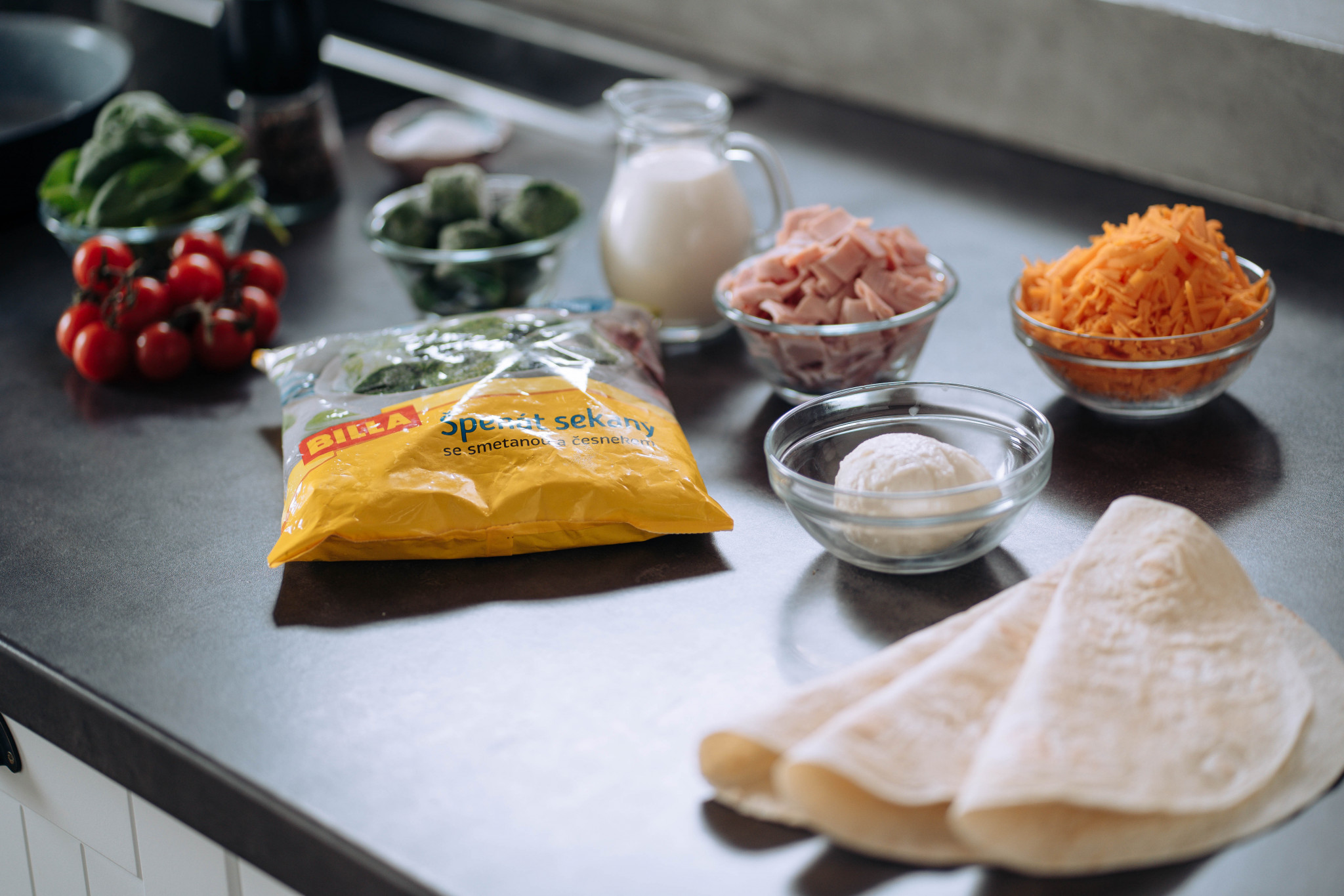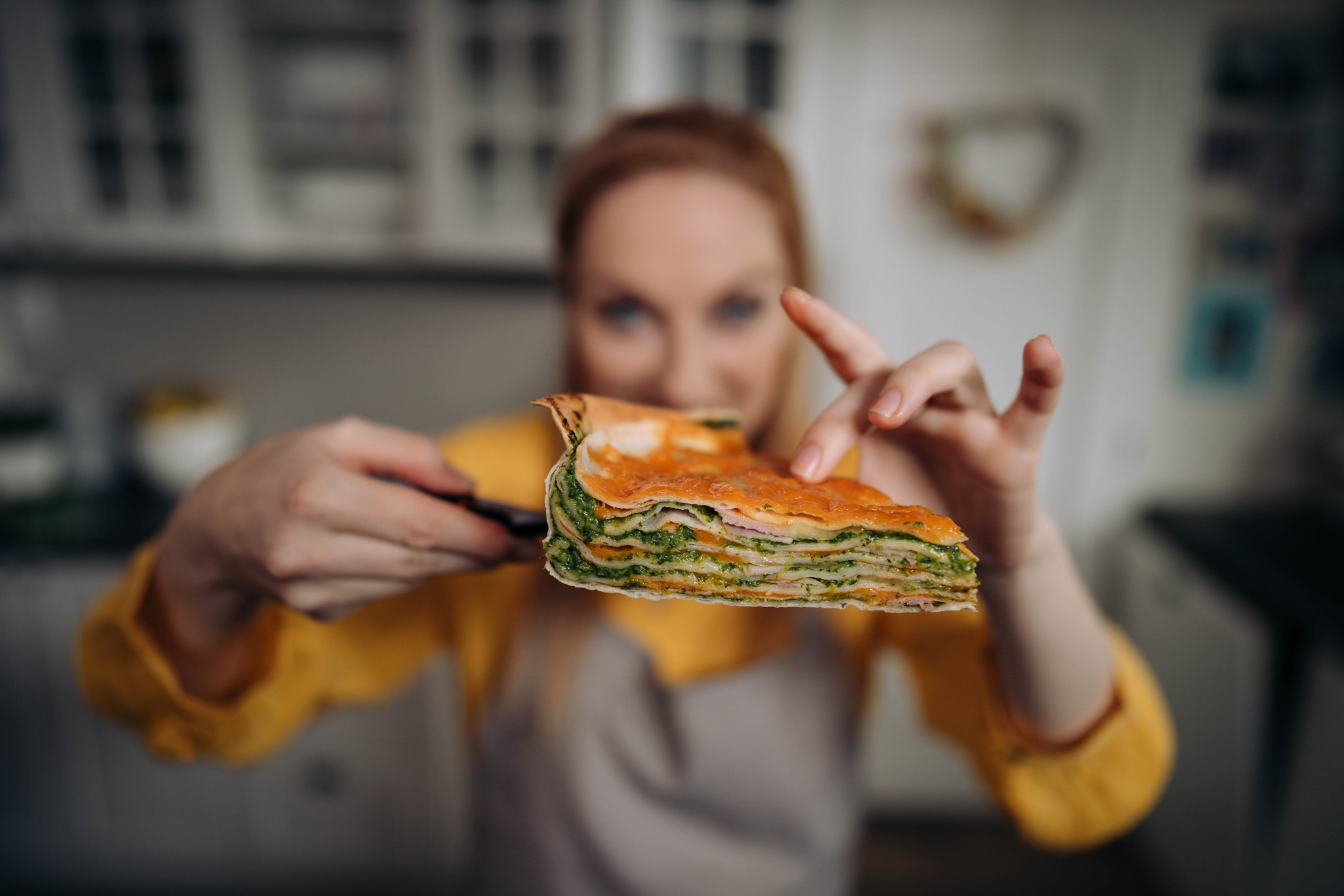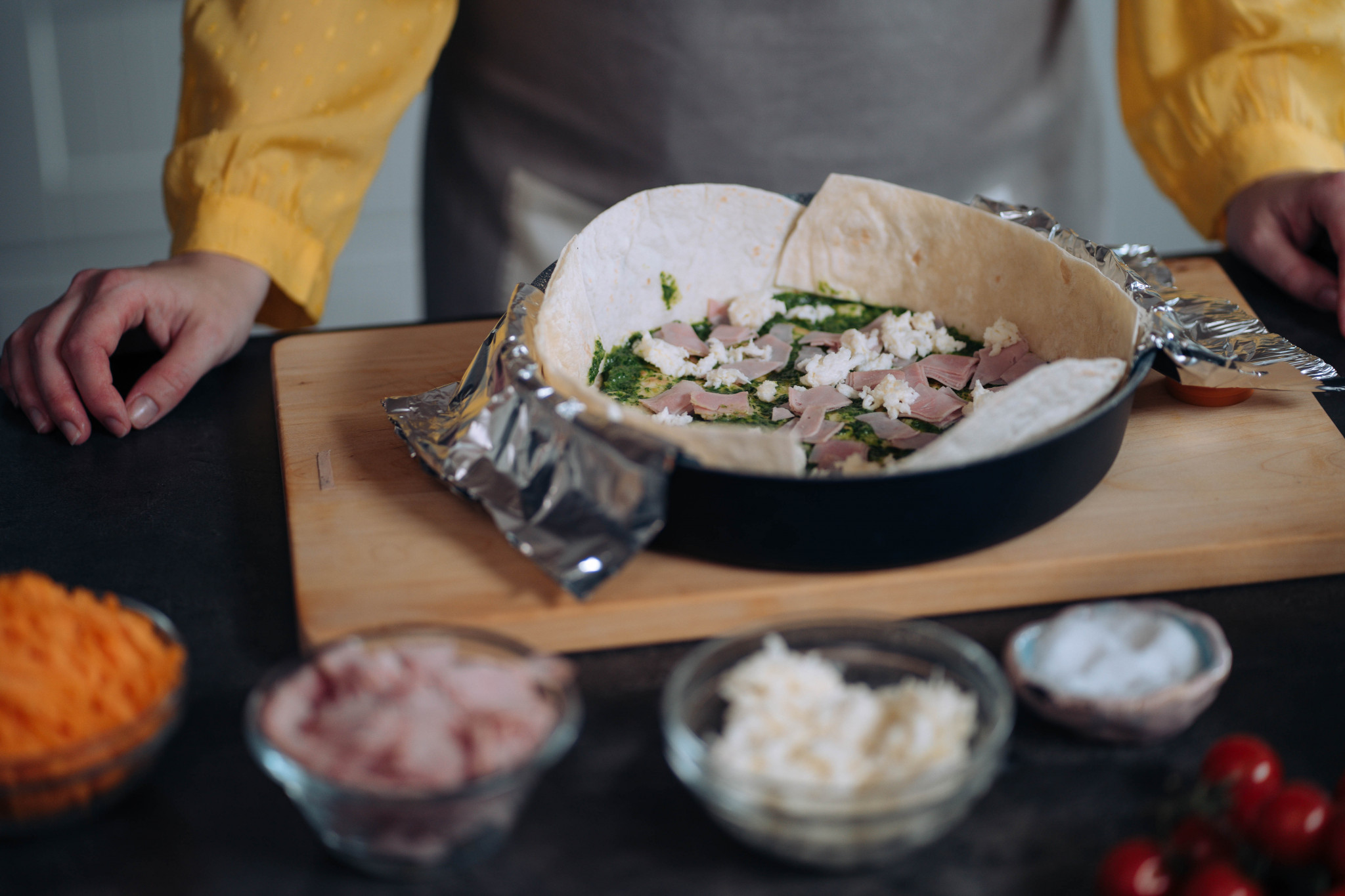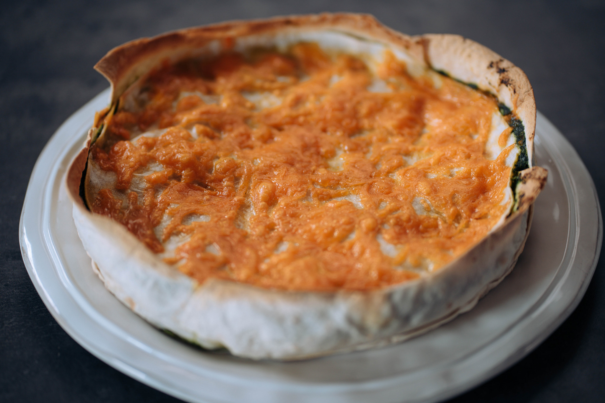 Tohle je parádní záležitost pro začátečníky. Potřebujete jen troubu a pečící formu. Výsledek vypadá parádně. Je to něco mezi lasagnemi, palačinkovým slaným dortem a quichem. Akorát že je to vlastně skoro bez práce. A co je důležité nejen pro figuru, ale právě i pro nezkušence – bez nutnosti přípravy bešamelové omáčky, protože nám celé to zvlhčování zahustí obyčejný mražený špenát! Hlavní roli tu hrají klasické velké pšeničné tortilly, které koupíte v balení po šesti nebo osmi. A uděláte s nimi spoustu parády!