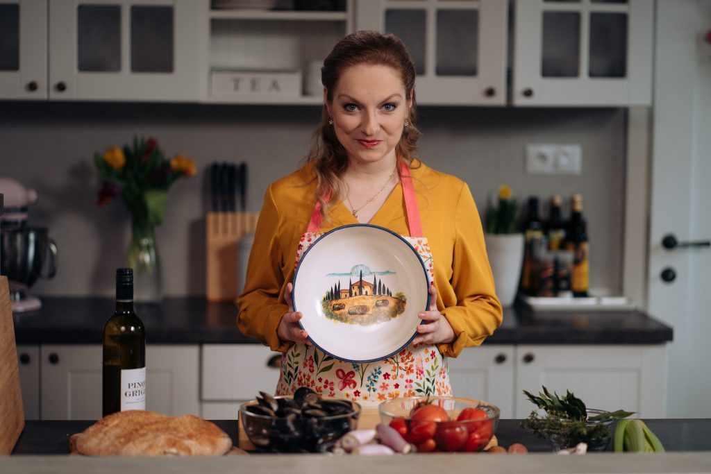 Na dovolené v Toskánsku jsme před dvěma lety bydleli v takovém malém domečku se zahrádkou, kde rostly nádherný rajčata, horda bylinek. Já jsem jeden večer koupila spoustu očištěných slávek, ten jejich křupavý chleba, bílý víno a vytvořila něco, co když si uvařim doma, tak mě to tam vždycky dostane zpátky. A navíc to naservíruju do misky, kterou jsem si přivezla.