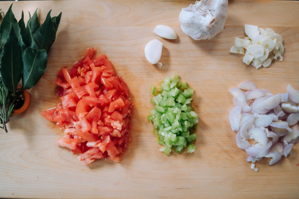 Nakrájejte na kostičky jedno pěkné, velké a hlavně zralé rajče, hodně nadrobno taky řapíkatý celer, česnek na tenké plátky, banánovou šalotku na půlkolečka.