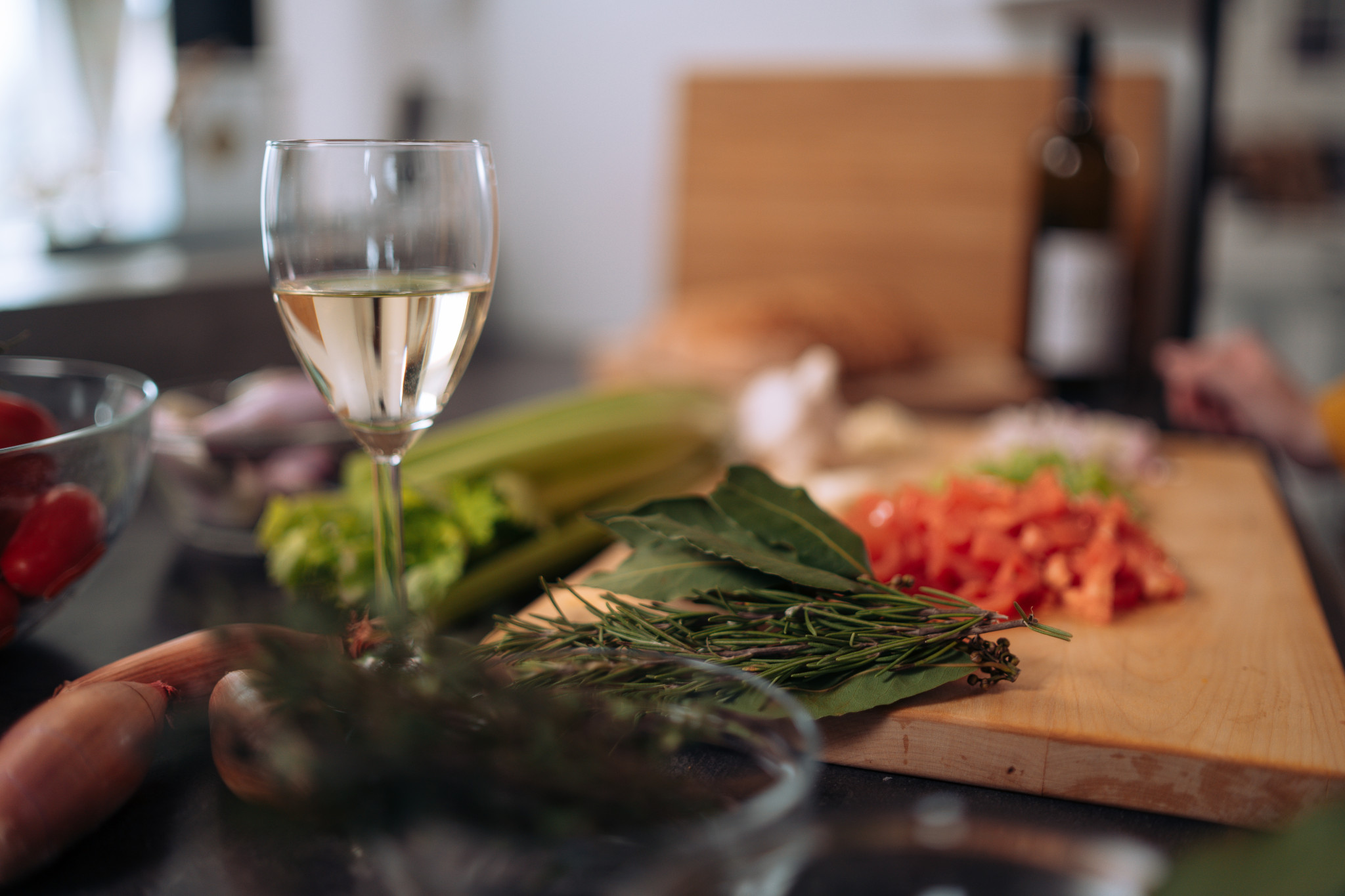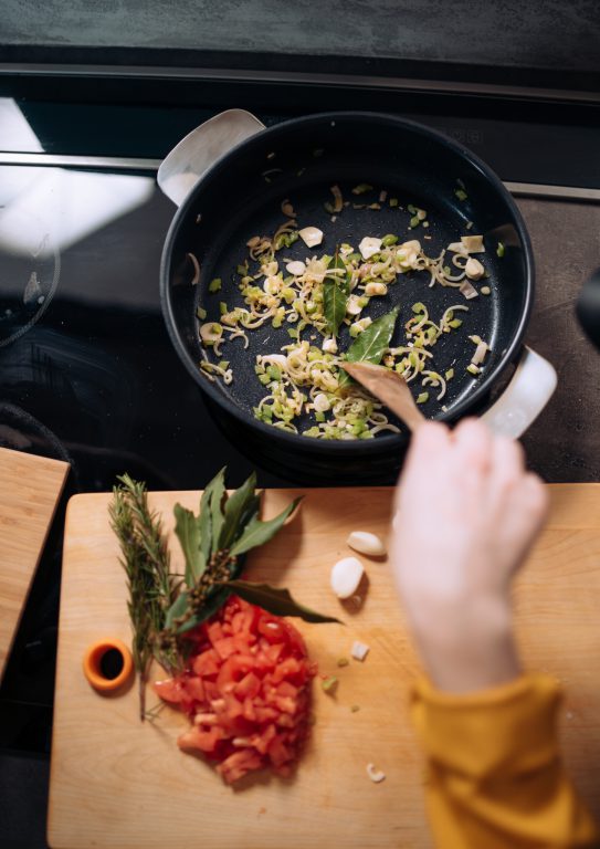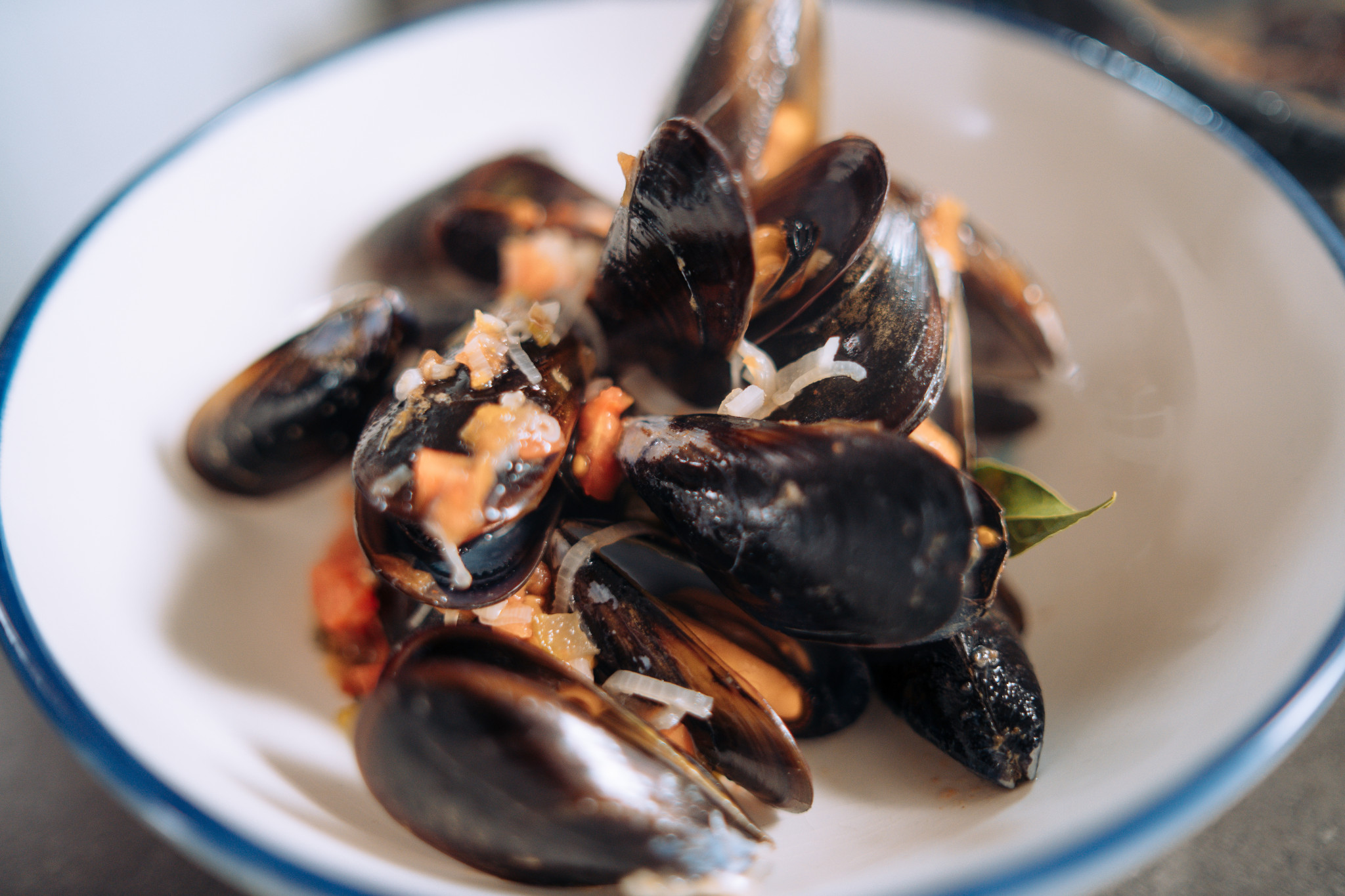 A teď se vrháme na mušle. Na olivový olej směřuje nejprve řapíkatý celer, následuje k němu šalotka, česnek na tenké plátky, bobkové listy a víno… na poslední chvíli rajče. Lehce osolíme, opepříme a můžeme přidat i špetku chilli. Do připraveného základu teď už přebrané a očištěné slávky.