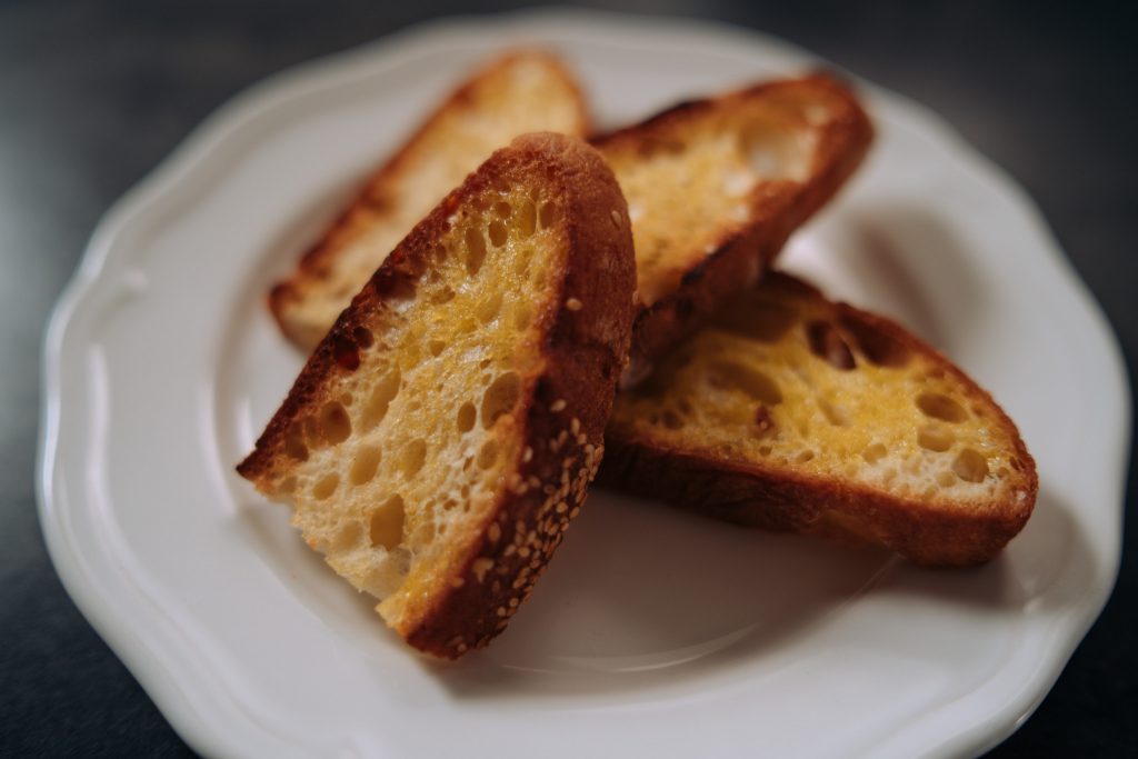 Na řadu přichází suché bílé, ideálně toskánské víno a také chléb italského typu, nožem na pečivo ukrojíme pořádné krajíce. Na olivovém oleji s rozmarýnem je na pánvi opečeme dozlatova, no a následně dáme stranou.
