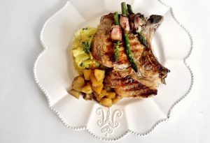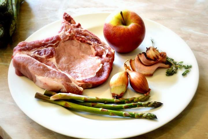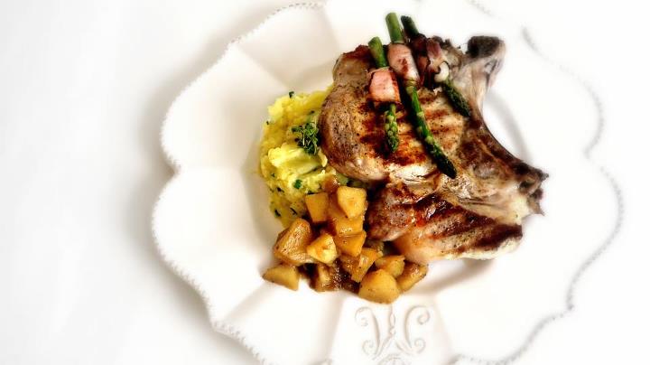 Stonky chřestů zbavte dřevnatých konců. Pokud je chřest už silný a má tedy i silnější slupku, škrabkou na brambory ji oloupejte, u hlaviček už může zůstat. U tenkých „klásků“ to není nutné. Zabalte do slaniny. Dejte restovat na pánev spolu s kotletkou. Chřestu stačí minuta po každé straně, kotletě 3-4 minuty po každé straně, podle toho, jak je vysoká. Pak na pekáč do trouby rozehřáté na 170 stupňů obojí přendejte a nechte zatáhnout. Opět jde o výšku i celkovou hmotnost masa. Pokud uvažujeme klasickou 200g kotletu s kostí, stačí cca 8 minut. Pokud byste měli takového obra jako já ve videu, spíš počítejte s 10ti minutami, pokud nechcete mít maso růžové u kosti, možná i 13 min – tím ale začně už trochu tvrdnout maso. Jeho propečenost můžete kontrolovat lehkým stiskem povrchu přímo v troubě např. pomocí vařečky. Vepřové maso není tolik pružné jako hovězí, ale princip kontroly je stejný jako u bifteků. Uprostřed se musí dát ještě stlačit. Čím méně stlačit jde, tím je tvrdší a propečenější. Chce to si to párkrát na vlastní hmat vyzkoušet a dostanete grif už navždycky.