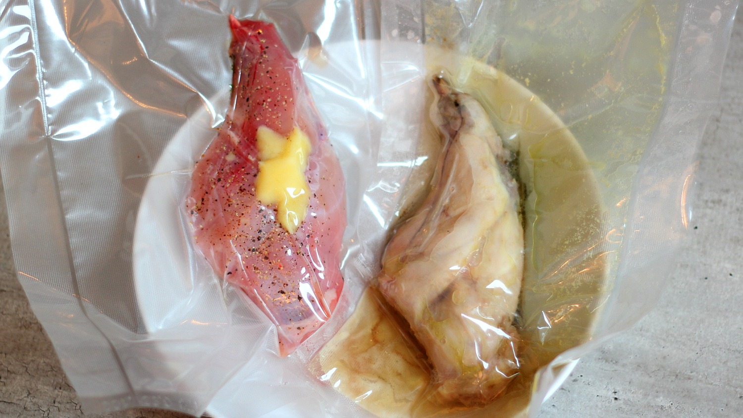 A teď k receptu. V případě vaření v sous-vide lázni tedy omyjete a osušíte králíka, je-li třeba. Osolíte a opepříte z obou stran. Do speciálního pytlíku na sous-vide vložíte čerstvé bylinky a na ně tou „horší“ tedy dolní stranou první stehno. Přidáte trochu másla. Zavakuujete. Vložíte do lázně na cca 78 °C a necháte to tam pěkně plovat minimálně 6, klidně i 8 hodin. V restauraci La Bouchée v Brně, kde jsem se nechala tímto receptem inspirovat, ho museli nechat možná i dvakrát déle. Maso bylo úplně kašovité. Na mě to bylo až moc. Když v lázni něco mácháte příliš dlouho, ztratí to obvyklou texturu, a tak se mi zdá lepší to nepřehánět. Pak buď oberete maso odpadající od kostí a nebo necháte vcelku. Každopádně ale ještě na másle nebo oleji narychlo a zprudka dohněda orestujete na pánvi. Šťávu, kterou maso pustilo do pytlíku nevylíváme, je to skvělá ingredience do omáčky. Čistý králičí sos ochucený máslem a bylinkami. Výhodou zpracování je úžasná šťavnatost jinak poměrně suchého masa.