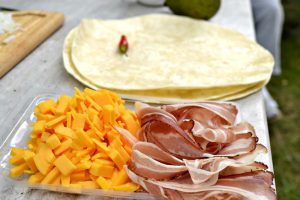 A pak už se vrháme na pánev. Kuřecí maso osolte, opepřete, okořeňte směsí mexického koření a potřete olejem. Pokud pracujete uvnitř na sporáku, můžete si cibuli a slaninu nakrájet na malé kousky už teď předem. Na vypečeném tuku ze slaniny vše dozlatova orestujte a vyjměte. Otřete povrch pánve papírovým ubrouskem, na tortillu není třeba tuku. Položte placku na rozžhavený povrch a přidávejte všechny ingredience nakrájené na malé kousky. Přehrňte, opatrně obraťte a za 2 minuty je hotovo. Chedar musí být rozteklý a na tortile tmavá místa. Mě se to lépe konzumuje takhle vcelku, ale můžete quesadillu rozkrájet i na 3-4 trojúhelníky. Pak už jen lžíce tučné kysané smetany a vzhůru do toho!