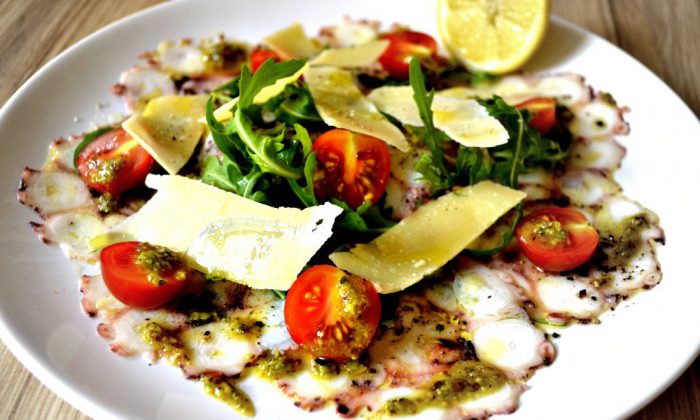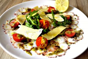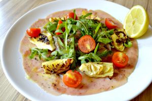 Carpaccio z chobotnice s pistáciovým pestem a parmazánem 190 Kč – tenounce nakrájené plátky k sobě nasoukaných vařených chapadel jsou jemné a svěží – doplnit výraznější chutí pesta si zaslouží, rukolu s cherry rajčátky uvítáte pro hořkost i křupavost. Citronáři využijí možnost okyselení, ke všemu je servírováno domácí měkké pečivo a možnost hojného připepření obřím mlýnkem. Snad ještě víc mi ale chutnalo Carpaccio z tuňáka s grilovanými artyčoky 210 Kč. Mou přízeň si předkrm získal pro skvěle zpracované naložené artyčoky pomazlené na chvilku na rozpáleném grilu. Jejich chuť byla naprosto brilantní, dala bych si je klidně samotné. Tuňák ale v dochucení nezaostával. S pepřem, salátkem a citronem platí to samé co u chobotnice.