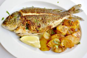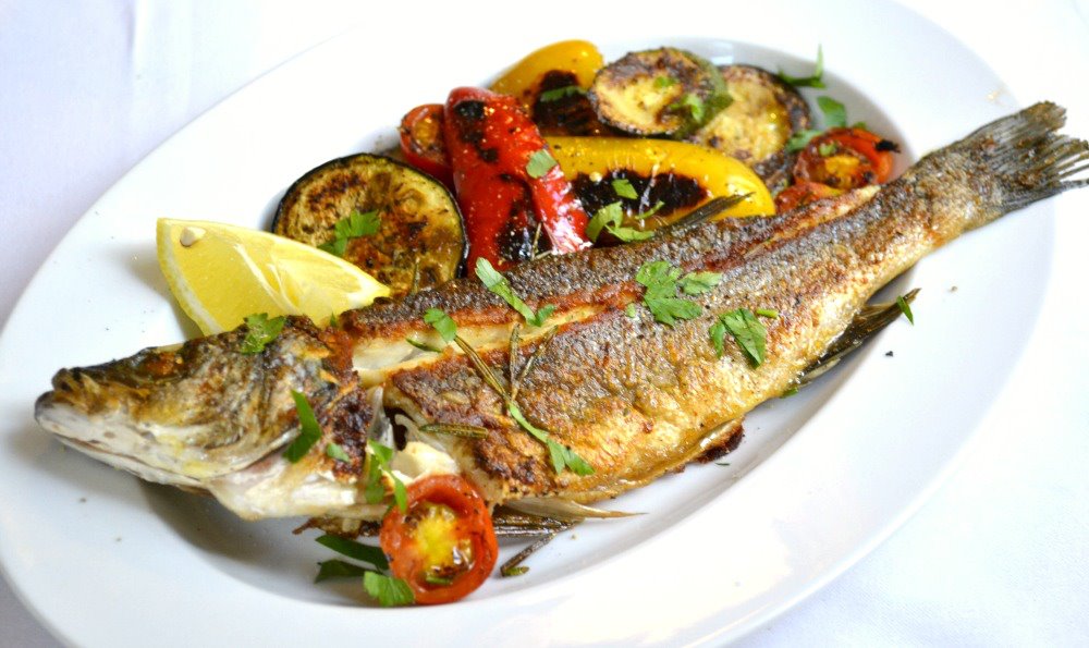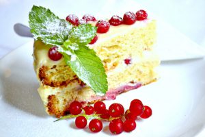 Pro hlavní rybí chody tu platí pravidlo rozpáleného grilu na absolutní maximum, aby nebyly vařené a současně aby kůže křupala tak, jak to doma na pánvi nikdy neuděláte. Záleží, co vám chutná víc. Já ocenila grilovanou pražmu s pečenými brambory s mořskou solí a rozmarýnem 285 Kč. Málo kostí, velmi lehce dranžírovatelná ryba se skvělou mořskou chutí a navíc, to platí u všech tady,tak čerstvá, jak jen v našich končinách může být. Grilovaný mořský vlk s čerstvou grilovanou zeleninou 325 Kč byl ale zas šťavnatější a jelikož zelenina byla absolutně skvělá, vlastně klidně samostatně poživatelná jako vegeratiánský předkrm například, je to těžká volba. Obsahovala lilek, cuketu a papriky. Zkrátka tedy obojí supr. Dezerty tady dělají zásadně domácí a nabízí se to, co právě je. Tohle byl svěží dort s pudinkovým krémem a čerstvým rybízem – kombinace se skvěle hodí k letním dnům, oceňuji využití sezonního ovoce. Jindy to může být také sorbet a nebo třeba tiramisu.