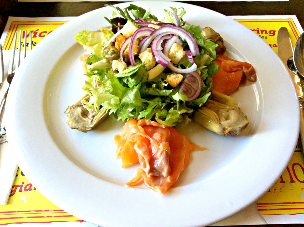 Respekt před domácím sušením. Paráda. Následoval Salát z artyčoků s uzeným lososem (295 Kč), tvary a barvy listů, na které si jenom vzpomenete, s plátky jemně opět jimi samotnými uzeným lososem. Salát mohl být trochu lépe promíchaný s dresinkem a snad ho ani nemuselo být tolik, nicméně v kombinaci s výborným lososem stojí za ochutnání. Artyčoky jsem měla už i lepší…takže tohle byl asi nejslabší článek programu. Nicméně pořád nadstandard oproti všem ostatním salátům s uzeným lososem, které jsem měla.
