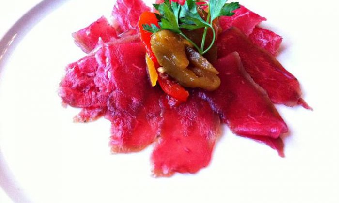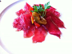 Ale k jídlu – nejprve tedy variace pečiva s olivovým olejem, balená jako v pekařství stylově do papírového pytlíku s potiskem názvu a loga restaurace, a pak už přichází předkrmy. Domácí sušené hovězí maso v jalovci s paprikovým relich (195 Kč) bylo naprosto úžasné spojení, perfektně chuťově vyladěných ingrediencí.