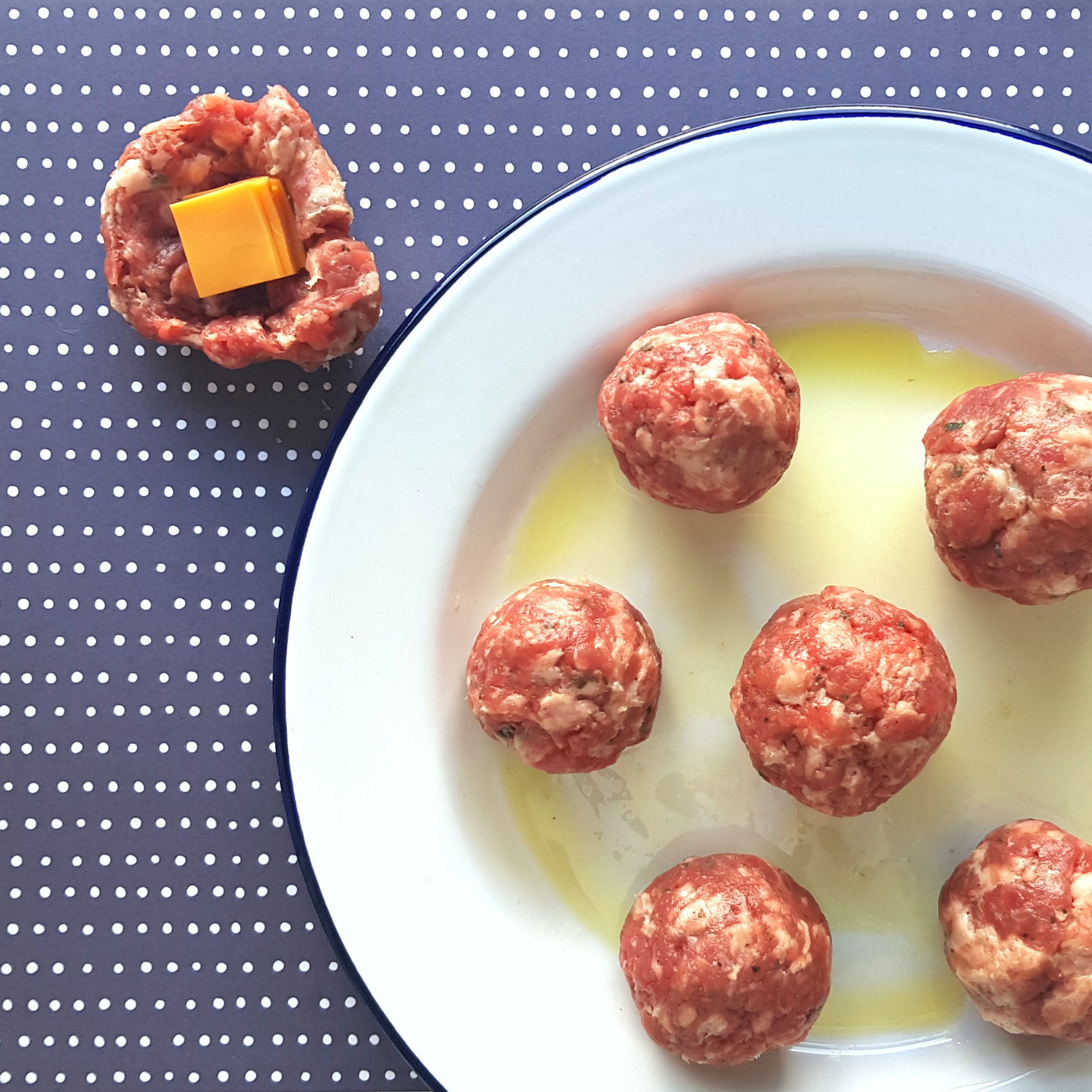 Z hamburgřího masa o váze 250 g jsem zvládla vymáčknout 8 kuliček. Plátky chedaru nakrájejte napůl, překlopte… Pak napůl, překlopte… Pak zas … Vy to jistě chápete. Naplnit maso je absolutné hračka, stačí v kuličce udělat důlek a pak zas zpátky zaoblit. Když jsou kuličky připravené, potřete je všude olivovým olejem a nechte v chvilku v pokojové teplotě než půjdou na mřížku.