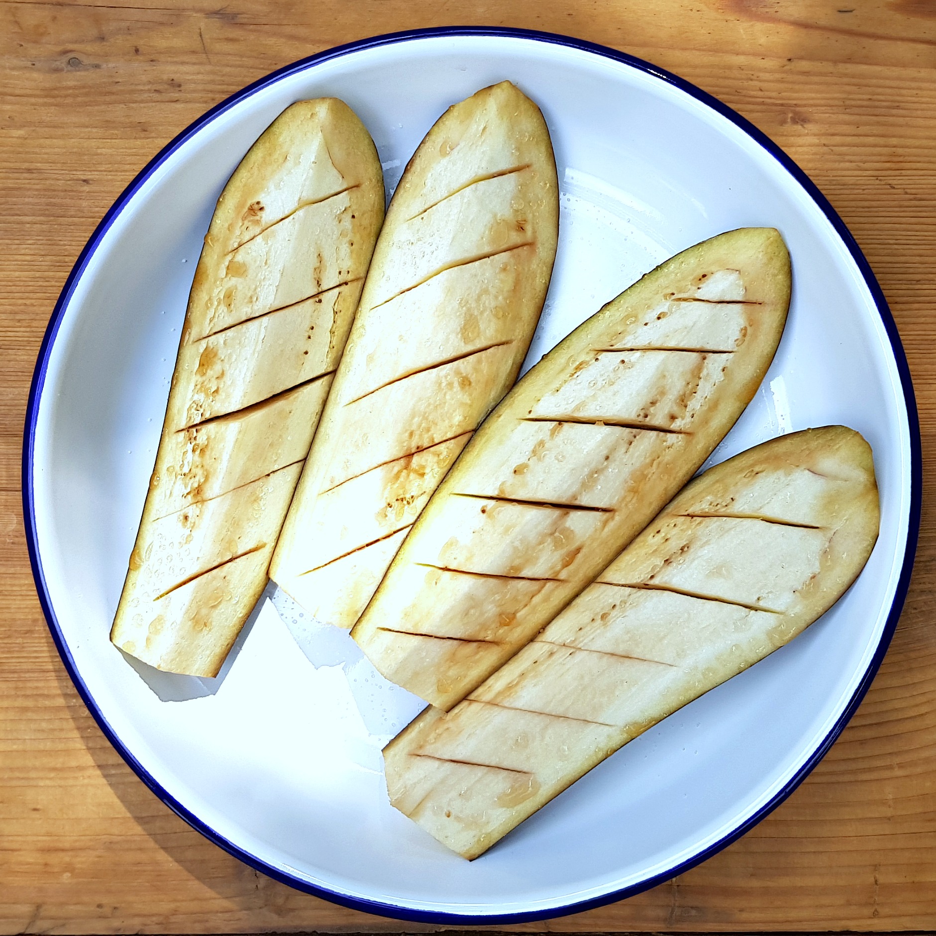 Během toho nakrájejte lilek na podélné čtvrtky (opravdu velký a macatý na šestiny nebo osminy) a v dužině nakrojte hlubší zářezy. Obvykle lilek předem nenasoluju, ale v tomhle případě ano, protože ve chvíli kdy takové klínky grilujete, sůl na nich nechce moc držet, takhle jde pěkně dovnitř. Stačí ho nechat potit půl hodiny před tím, než ho začnete grilovat. Jen ho před rožněním otřete papírovou utěrkou, protože pustí dost vody. Pak ho ještě potřete nebo posprejujte olivovým olejem.