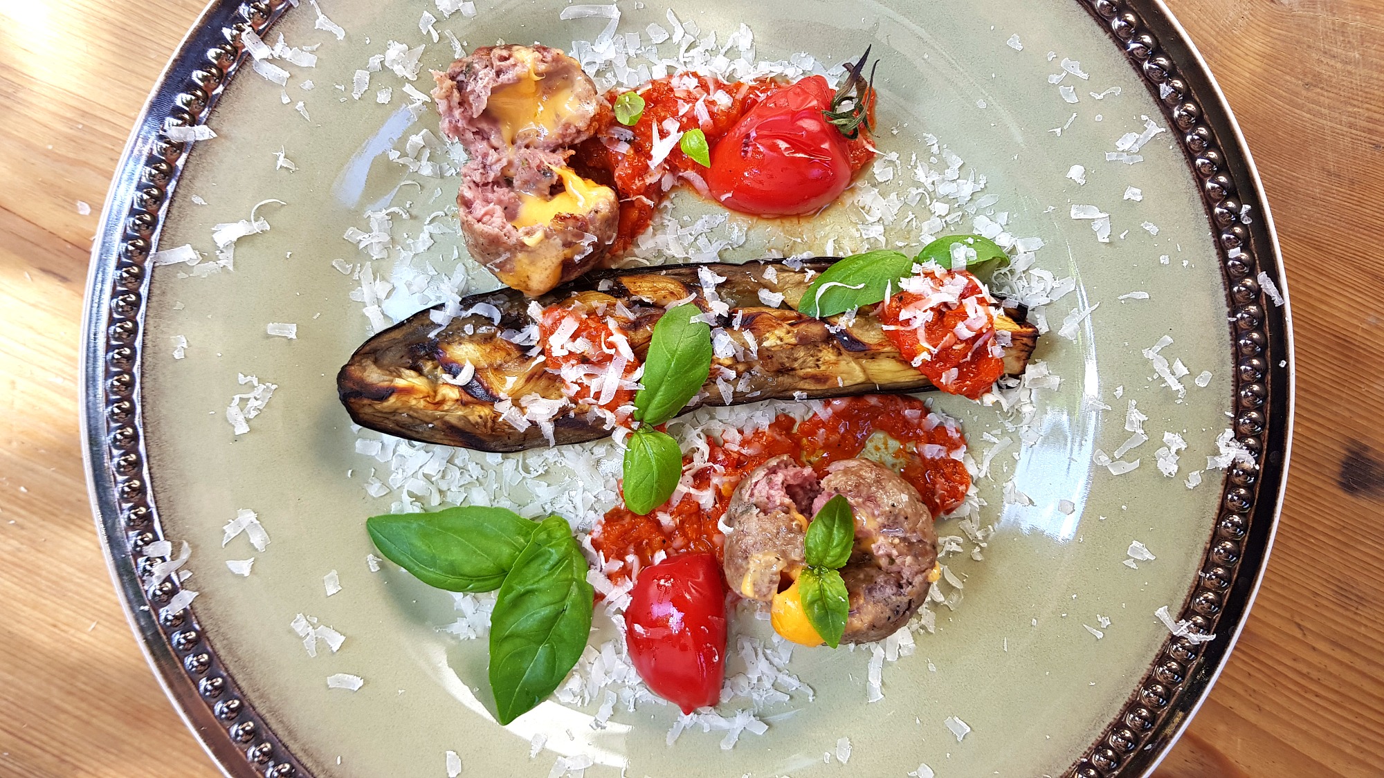 Když už je lilek hotov dejte ho do míst, kde se bude jen hřát, ale už ne dál péct. Naopak na co největší plamen teď musí zamířit kuličky potřené olejem spolu s celými cherry rajčátky. V přiklopeném grilu postačí 5 minut, aby se zatáhly, místy zezlátly, sýr uvnitř se roztekl a mohli jste podávat.