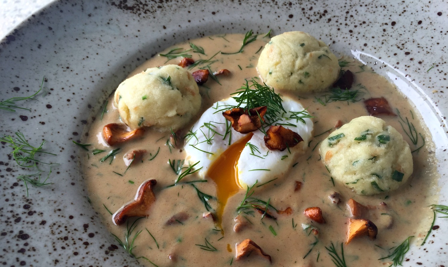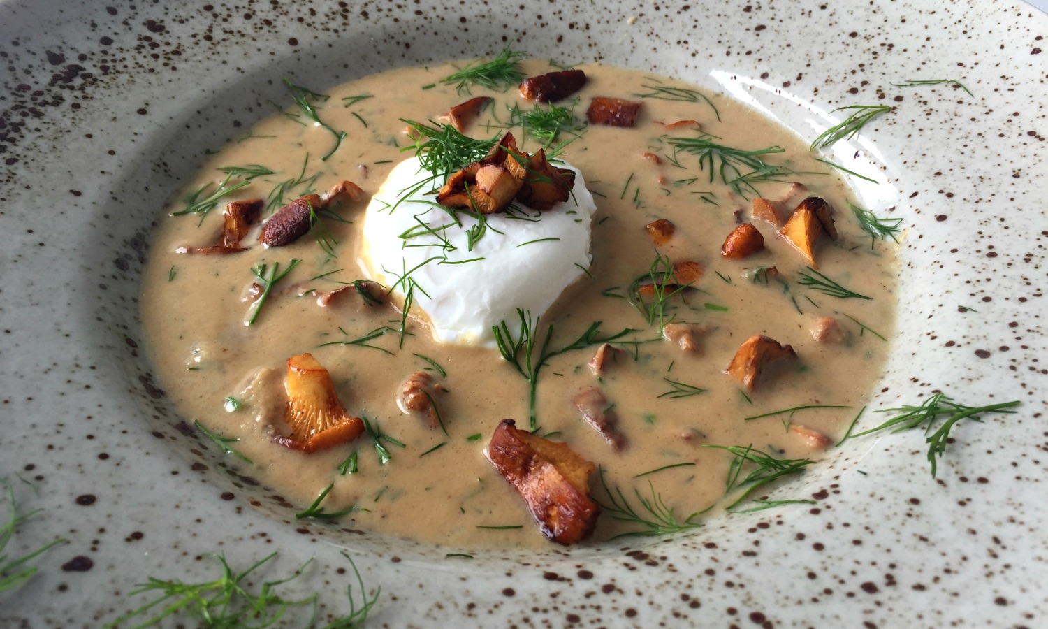 Vejce (ať už pošírované nebo opatrně oloupané šestiminutové) stačí ohřát v misce s horkou vodou. Nasekat úctyhodné množství kopru. Dvě třetiny vmíchejte v poslední minutě do hotové omáčky. Do hlubokého talíře naservírovat horkou omáčku (polévku), přidat vejce, ozdobný kopr navrch a posypat opečenými kusy lišek. Tradáá.