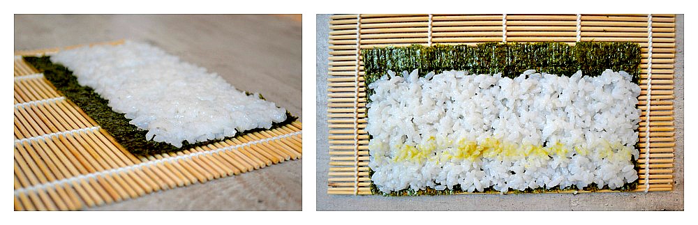 Už studené můžeme začít vrstvit na Řasu nori. Tu pokládáme na rolovací podložku vždy lesklou stranou dolů, hrubou nahoru. V začátcích, když si člověk není příliš jist, můžete používat na maki 2/3 velikosti řasy. Pak postačí polovina. Můžeme ji buď rozstřihnout nebo přeložit a roztrhnout. Řasu dejte až na kraj podložky. Rozmístěte na ni v tenké vrstvě malou hrst rýže. Výška rýžového sloupce určitě nesmí přesáhnout 0,5 cm. Doporučuju 3 mm. Všude by mělo být rýže stejně. I úplně na krajích. Jen 1-1,5 cm široký pruh nejdál od sebe na řase nechte bez rýže. K ruce si připravte misku s ledovou vodou a pár kapkami octa na sushi. Ponořte tam prsty vždy, když prsty budou kvůli lepivosti rýže vyhlašovat poplach.
