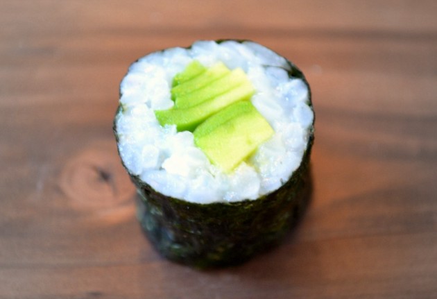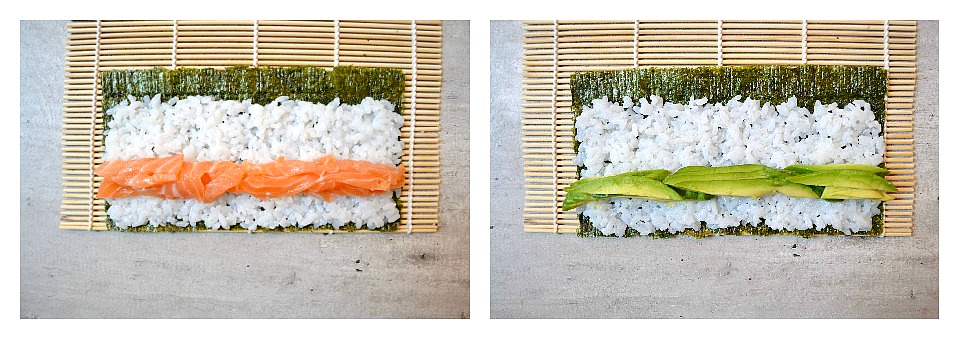 Náplně do maki sushi mohou být různé. V dnešní době se fantazii v sushi meze rozhodně nekladou. Lidi si spíš navymýšleli až příliš mnoho variant. Stálicemi jsou ale jednoznačně losos, tuňák a další syrové, leč opravdu čerstvé ryby určené i ke konzumaci za syrova, krevety, chobotnice, ale i žlutá ředkev, avokádo, mango, klasická okurka hadovka, houby shi-take… Leč se vám může zdát množství dané na rýži až až dostačující, po pořádném stažení do rolky si beztak řeknete, že jste mohli přidat. Ale to uvidíte, až budete mít první urolovanou. Náplň se každopádně dává spíše ve větším množství tenounkých plátků než v jednom kuse s průřezem 1×1 cm. Sushi se pak i lépe konzumuje. A jaké je správné množství? Řekněme prostředníček na ruce dospělé ženy s BMI kolem 21. :-D. Asi tak….