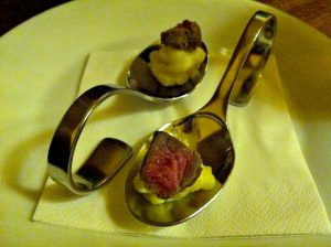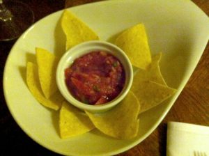 Poučena právě zažitým nezdarem na telefonu vyhledávám jejich číslo a raději se rovnou dotazuji, zda je místo pro dvě hladové duše, které by se rády do čtvrt hodiny usadily někde v teple. V Mánesce to, jak jsem později zjistila, tak horké nebylo. Obsazeno bylo tak z poloviny a přesně to odpovídalo i následujícím výkonům kuchařů i obsluhy. Za můj gastrozážitek dostávají 5/10 bodů, což znamená, že už se sem vracet nemám touhu, resp. nemám důvod. Asi to bude znít, že si hřeju vlastní polívčičku, ale ve výsledku se líp najím doma, až si budu chtít ugrilovat biftek se zeleninou a k tomu pro někoho ještě uvařit kuřecí paličky a krevety… Na začátek tu bylo pár nachos se salsou a pozorností podniku kousíček entrecotu na nepříliš zdařilých šťouchaných bramborech.