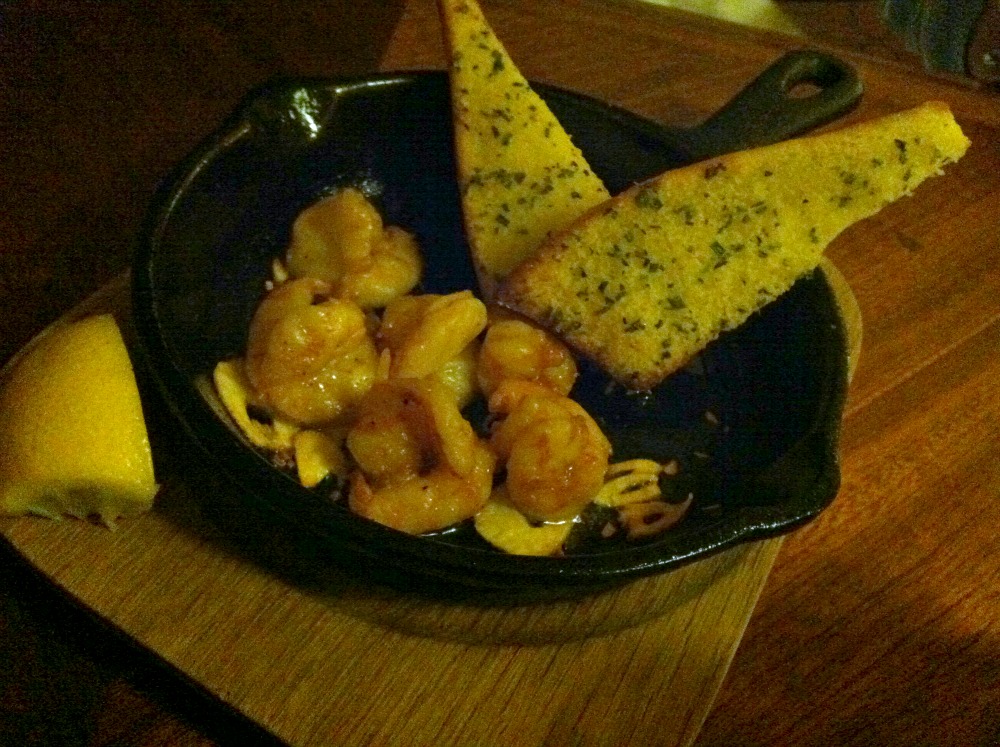 Přítel takové štěstí neměl. Když jdeme někam na večeři za účelem reportu, jídlo mu vybírám já. Sobě jsem naordinovala slibnější biftek, ale chtěla jsem poznat i zrádnější položky jídelního lístku, na kterých se mělo ukázat konečné resumé. První přišly marinované tygří krevety (60g – 6 ks) v panenském olivovém oleji s česnekem, česneková bageta 179 Kč. Někdo v kuchyni si řekl, že naleptané talíře se asi špatně myjí, takže povolali do zbraně horké pánvičky všeho druhu. Na dně bylo oliváče až až, bageta příjemně ovoněná sušenými bylinkami…krevety křupavé a snad i „čerstvé“ v našem obvyklém českém měřítku. Očištěné, takže konzumovatelné bez role toaletního papíru na utírání omaštěných rukou. Ale kouzlo, nápad, zajímavá chuť, něco navíc, šmrc, jiskra…nic z toho se ani zdaleka nedělo. NIC. Kdyby špetka koření, ba dokonce čerstvé bylinky. NIKDE. Festival průměrnosti. A v něm pokračujeme.