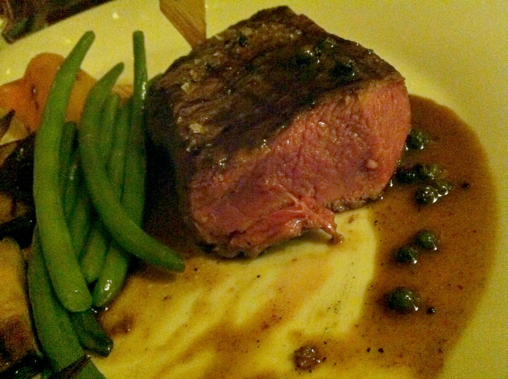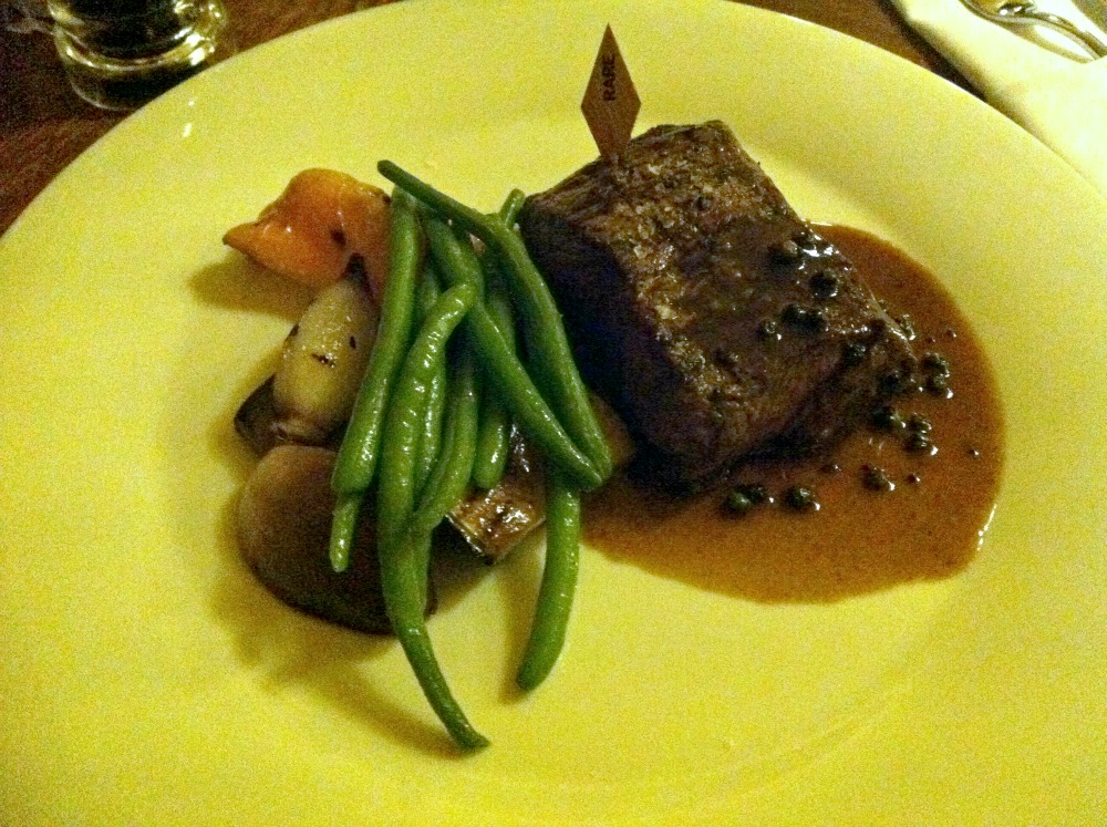 Začnu tím, co je tu nejdůležitější a co můžu také pozitivně ohodnotit: hovězí. 200g Oyster blade steak z podlopatkového svalu a pepřovou omáčkou 398 Kč, s grilovanou zeleninou 65,- Kč. Oceňuji přesnou trefu na kýžené propečení, v mém případě rare. Kdo neví, jak to chce, může vybrat podle obrázku v menu a přesně tak maso taky dostane. Bylo voňavé, kvalitní, šťavnaté. ALE jedna základní rada pro ty, které by jako mě napadlo dát si k němu grilovanou zeleninu. Stav propečení zřejmě odpovídá tomu, jak chcete i maso :-D Rare grilovaná zelenina = očernělá na povrchu, ale uvnitř křupavá a polosyrová. Paprika, červená cibule a hlavně cuketa – pokud objednávám grilované, nestojím o to, aby křupaly. U fazolek jsem to ocenila. Medium well byl paradoxně jen lilek, se kterým bývá často největší problém. Za tuhle grilovanou zeleninu bylo 65 Kč opravdu příliš. Pocit značného nedostatku jsem pocítila v oblasti pepřové omáčky. Na talíři tohle množství vypadá skvěle, ale kdybych dostala vedle do omáčníku bonus, využila bych ho s radostí. Nahřátý talíř mi demi-glace začala postupem osychu naleptávat a seškrábnout už nešla. Tak jsem tedy dopadla já.