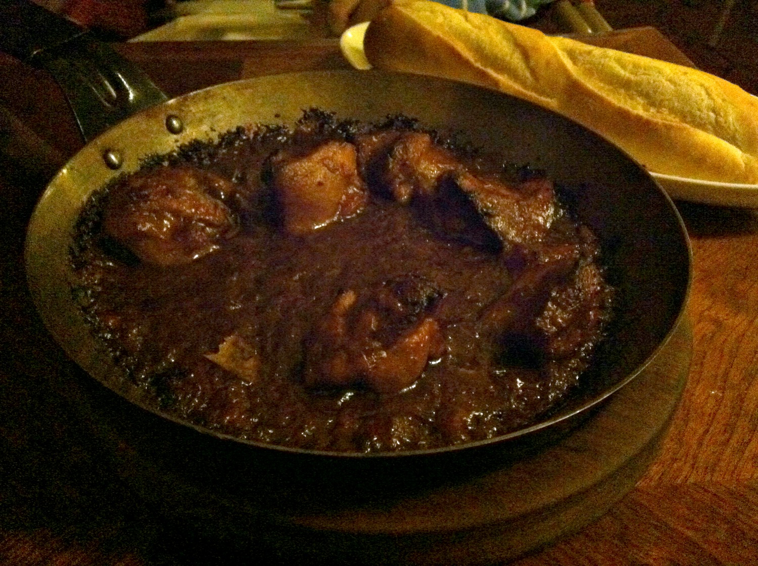 Doteď se vše dalo nějak omluvit, přežít, sníst. Podprůměrným výkonem musím ocejchovat Pikantní vykostěná kuřecí stehna (200 g) ve sladkokyselé omáčce servírované na pánvi s rozpečenou bagetou. Jestli tohle jídlo má vypadat a chutnat takhle, Máneska by si měla zakoupit černý fix a tučně ho v jídelníčku zaškrtat. Brrrr. Kusy stehenních řízků bez kůže, opět bez kouzla, nápadu, zajímavé chuti, něčeho navíc, šmrncu či jiskry – zato s připečeným sladkým kečupoidem (po pikantnosti ani stopy) a předpečenou bagetou z marketu hozenou na 8 minut do trouby. Ano, host, který neví, co chce, si dává kuřecí, ale natolik by ho za to v Mánesce za 197 Kč trestat přesto neměli. Záměr jim však vyšel. Kdybych tam měla příště jít, opravdu si raději dám ten dvakrát až třikrát dražší biftek. A tenhle způsob servírování bagety jako přílohy se mi zdá velmi nešťastný, stejnou jsem si mohla vybalit z igeliťáku koupenou v blízkém albertu.