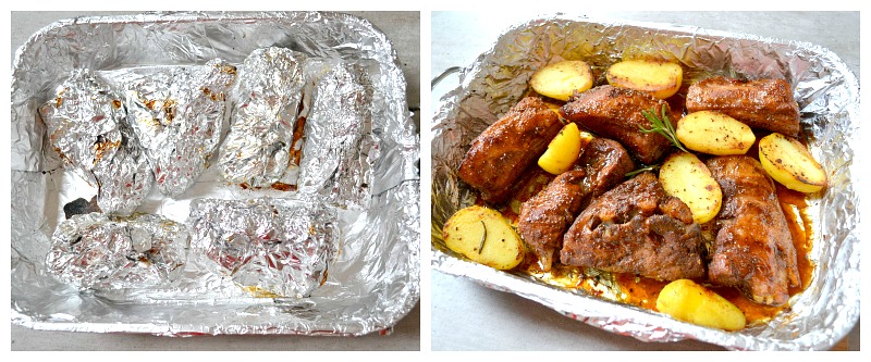 Hlavu jsem si nad tím lámala jen chvíli. Chtěla jsem docílit i co nejmenšího bince v kuchyni, abychom namachali co nejméně nádobí a měli co nejméně práce. Samozřejmě, že pro deset lidí už by to nebyl žádný med, ale do čtyř porcí je investice do alobalu schůdná. Výsledkem je tedy namarinování masa přímo v alobalu, ve kterém se druhý den i peče a pak se z něho jen vyjme a nechá se utvořit kýžený povrch žebírek pod grilem v troubě. Navíc, vše se dělá ve vlastní šťávě a marinádě, maximálně s přídavkem trochy černého piva.