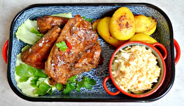 Příprava celého jídla je soustředěná ideálně do dnu před konzumací. Namarinovat žebra, uvařit brambory a klidně i udělat celý coleslaw můžete dopředu a pak už se s ničím nemusíte moc dělat. Navíc, vše má svůj smysl. Žebra potřebují čas, aby do sebe marinádu nasákla, brambory se vychladlé a odpočaté mnohem lépe opékají a odležený coleslaw v ledničce je mnohem lepší než čerstvý.
